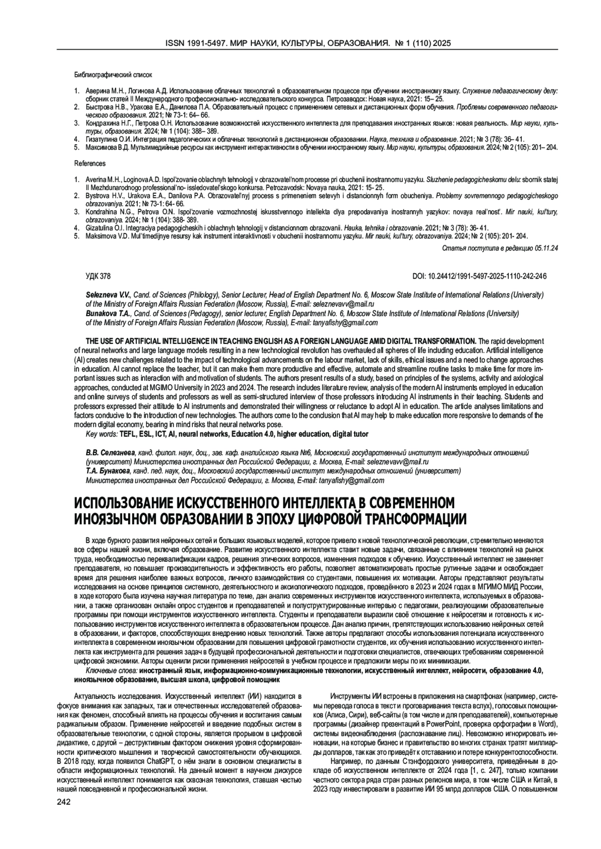 16. 	Селезнева В.В., Бунакова Т.А. Перспективы преподавания иностранного языка в высшей школе в условиях развития нейросетей. Магия ИННО: Перспективы развития лингвистики и лингводидактики в современных условиях: сборник материалов VI Международной научно-практической конференции. Москва, 2024: 456-463. Available at: https://inno-conf.ru/2024/6-2/impact-of-artificial-intelligence-on-efl-teaching-in-university-setting. EDN: DQUQTG