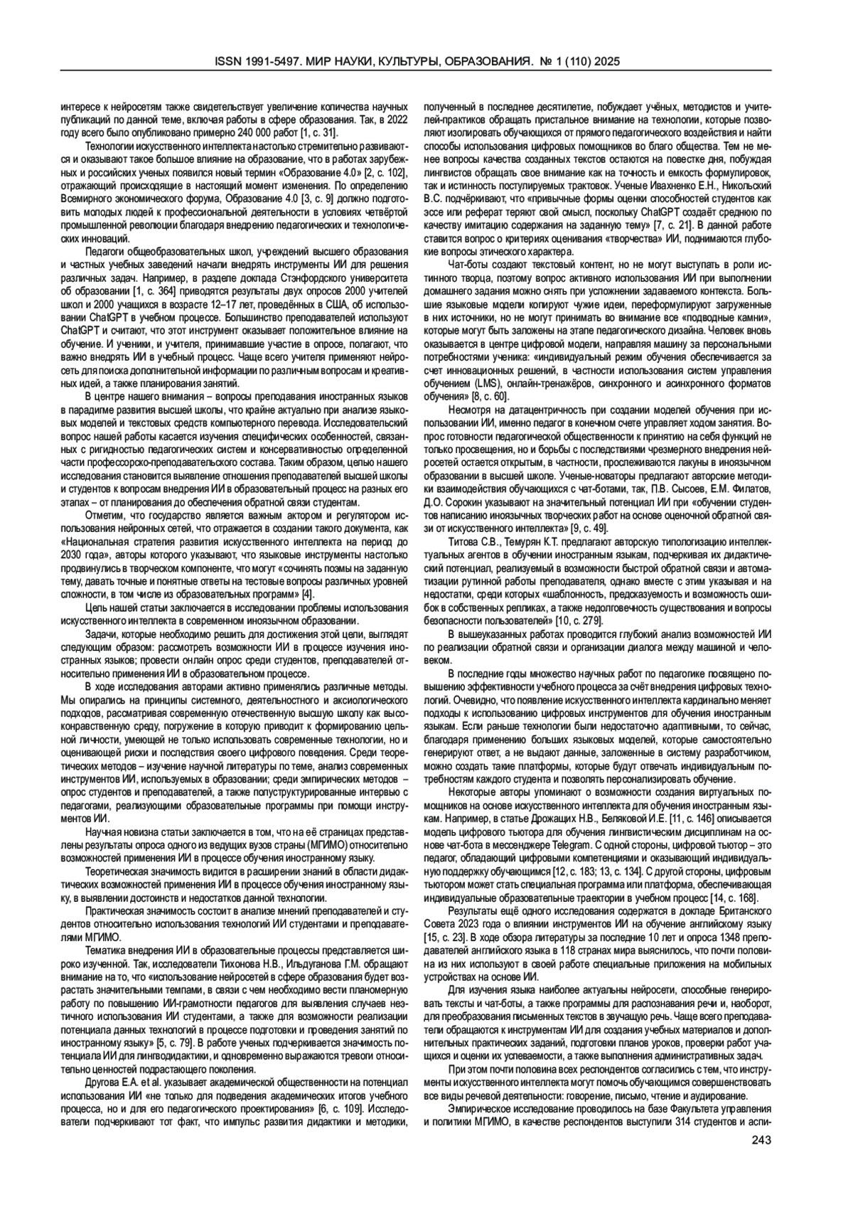 В ходе бурного развития нейронных сетей и больших языковых моделей, которое привело к новой технологической революции, стремительно меняются все сферы нашей жизни, включая образование. Развитие искусственного интеллекта ставит новые задачи, связанные с влиянием технологий на рынок труда, необходимостью переквалификации кадров, решения этических вопросов, изменения подходов к обучению. Искусственный интеллект не заменяет преподавателя, но повышает производительность и эффективность его работы, позволяет автоматизировать простые рутинные задачи и освобождает время для решения наиболее важных вопросов, личного взаимодействия со студентами, повышения их мотивации. Авторы представляют результаты исследования на основе принципов системного, деятельностного и аксиологического подходов, проведённого в 2023 и 2024 годах в МГИМО МИД России, в ходе которого была изучена научная литература по теме, дан анализ современных инструментов искусственного интеллекта, используемых в образовании, а также организован онлайн опрос студентов и преподавателей и полуструктурированные интервью с педагогами, реализующими образовательные программы при помощи инструментов искусственного интеллекта. Студенты и преподаватели выразили своё отношение к нейросетям и готовность к использованию инструментов искусственного интеллекта в образовательном процессе. Дан анализ причин, препятствующих использованию нейронных сетей в образовании, и факторов, способствующих внедрению новых технологий. Также авторы предлагают способы использования потенциала искусственного интеллекта в современном иноязычном образовании для повышения цифровой грамотности студентов, их обучения использованию искусственного интеллекта как инструмента для решения задач в будущей профессиональной деятельности и подготовки специалистов, отвечающих требованиям современной цифровой экономики. Авторы оценили риски применения нейросетей в учебном процессе и предложили меры по их минимизации.
