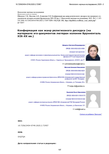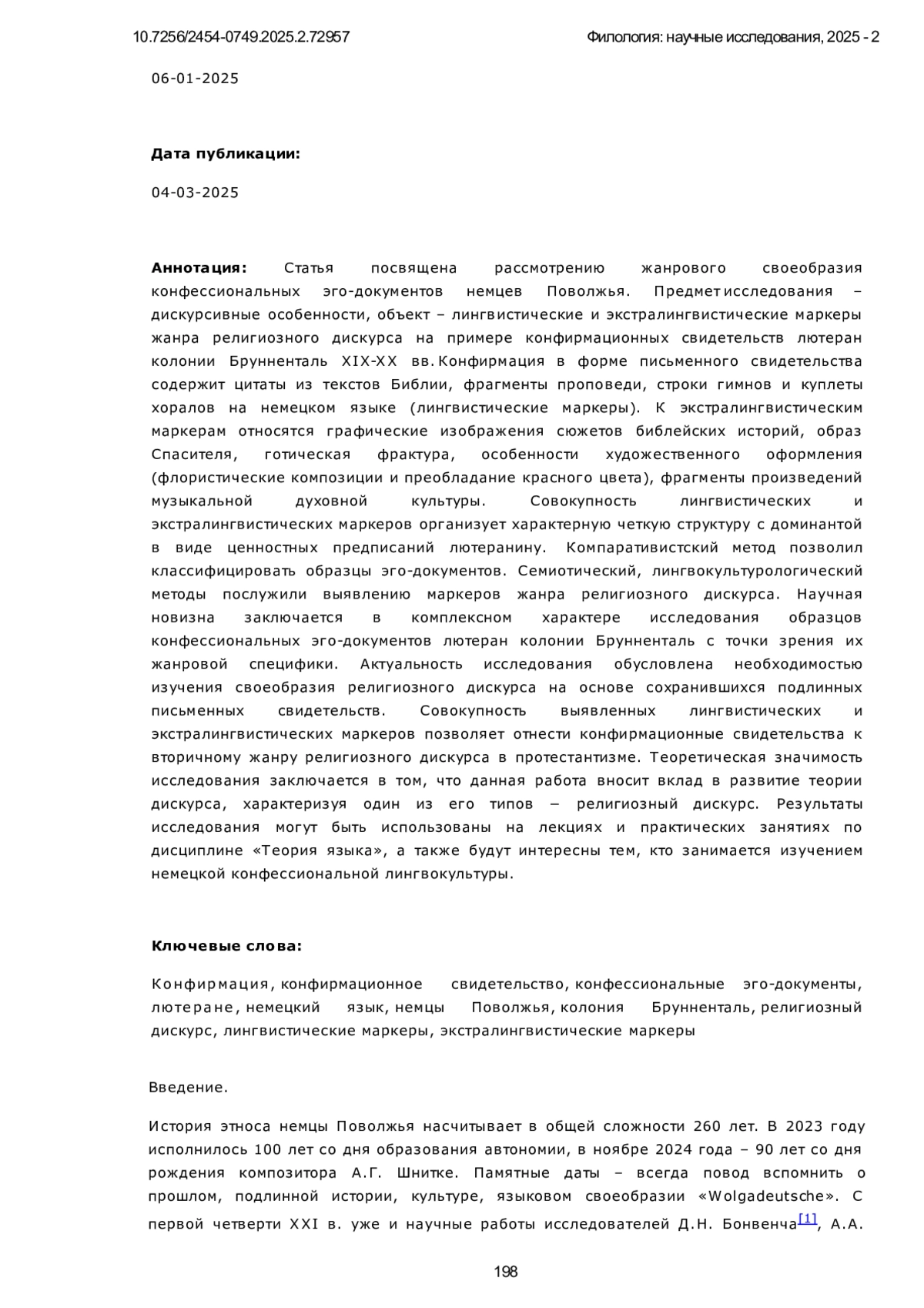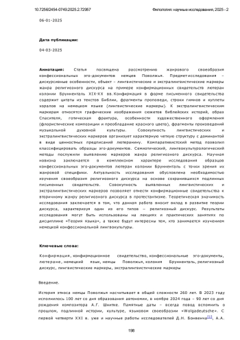 Статья посвящена рассмотрению жанрового своеобразия конфессиональных эго-документов немцев Поволжья. Предмет исследования - дискурсивные особенности, объект - лингвистические и экстралингвистические маркеры жанра религиозного дискурса на примере конфирмационных свидетельств лютеран колонии Брунненталь XIX-XX вв. Конфирмация в форме письменного свидетельства содержит цитаты из текстов Библии, фрагменты проповеди, строки гимнов и куплеты хоралов на немецком языке (лингвистические маркеры). К экстралингвистическим маркерам относятся графические изображения сюжетов библейских историй, образ Спасителя, готическая фрактура, особенности художественного оформления (флористические композиции и преобладание красного цвета), фрагменты произведений музыкальной духовной культуры. Совокупность лингвистических и экстралингвистических маркеров организует характерную четкую структуру с доминантой в виде ценностных предписаний лютеранину. Компаративистский метод позволил классифицировать образцы эго-документов. Семиотический, лингвокультурологический методы послужили выявлению маркеров жанра религиозного дискурса. Научная новизна заключается в комплексном характере исследования образцов конфессиональных эго-документов лютеран колонии Брунненталь с точки зрения их жанровой специфики. Актуальность исследования обусловлена необходимостью изучения своеобразия религиозного дискурса на основе сохранившихся подлинных письменных свидетельств. Совокупность выявленных лингвистических и экстралингвистических маркеров позволяет отнести конфирмационные свидетельства к вторичному жанру религиозного дискурса в протестантизме. Теоретическая значимость исследования заключается в том, что данная работа вносит вклад в развитие теории дискурса, характеризуя один из его типов - религиозный дискурс. Результаты исследования могут быть использованы на лекциях и практических занятиях по дисциплине «Теория языка», а также будут интересны тем, кто занимается изучением немецкой конфессиональной лингвокультуры.