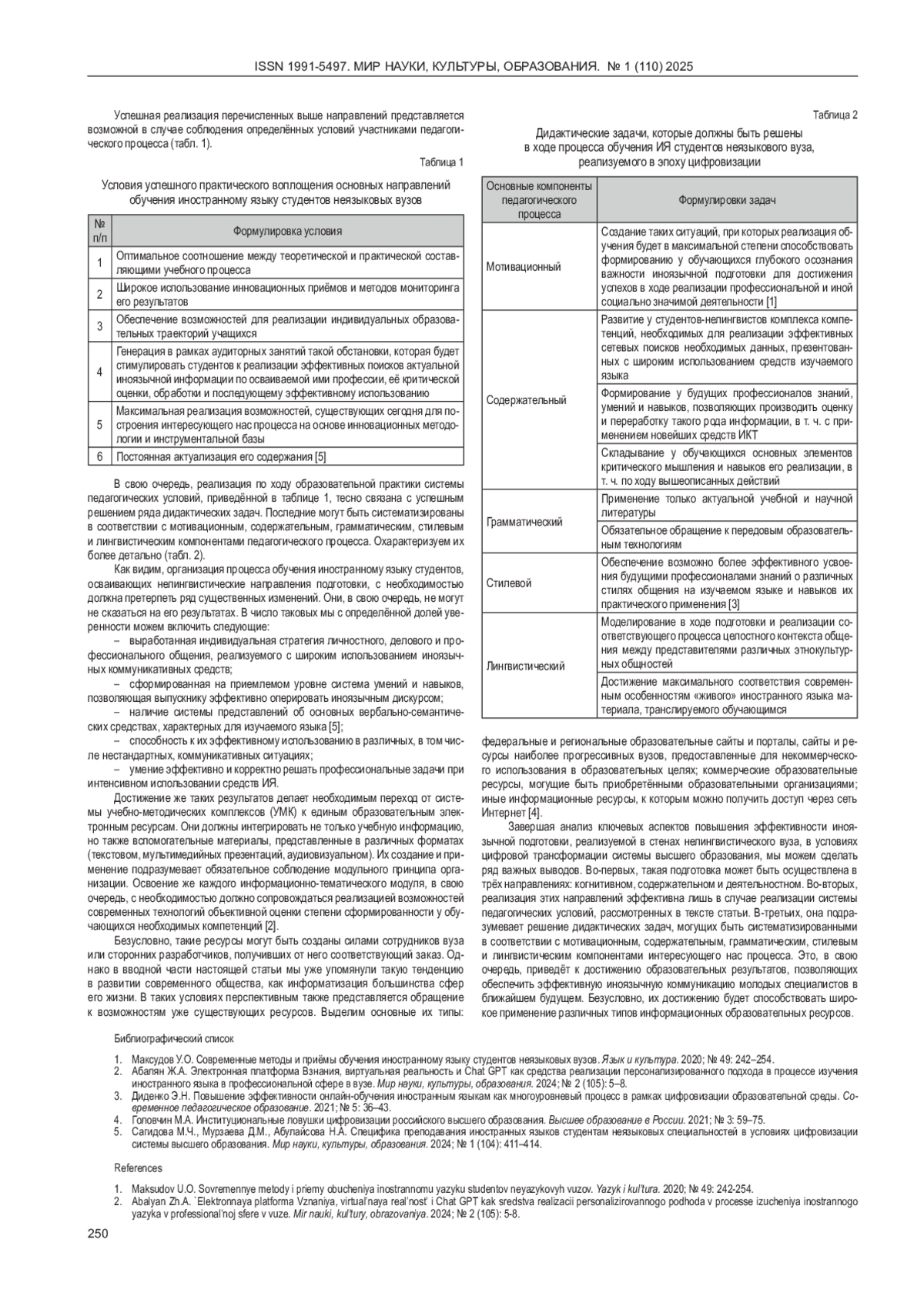 1. 	Максудов У.О. Современные методы и приёмы обучения иностранному языку студентов неязыковых вузов. Язык и культура. 2020; № 49: 242-254.