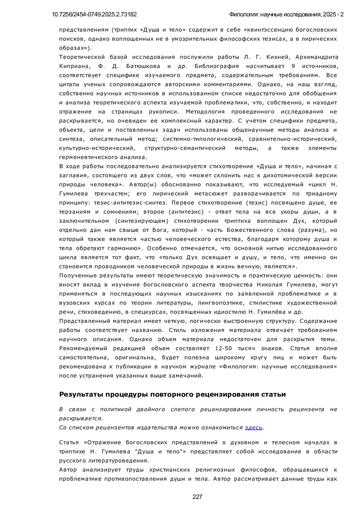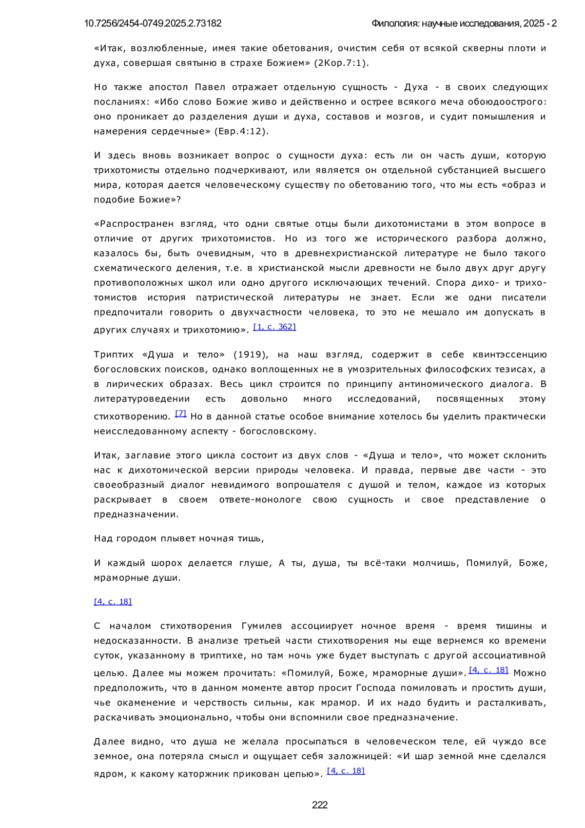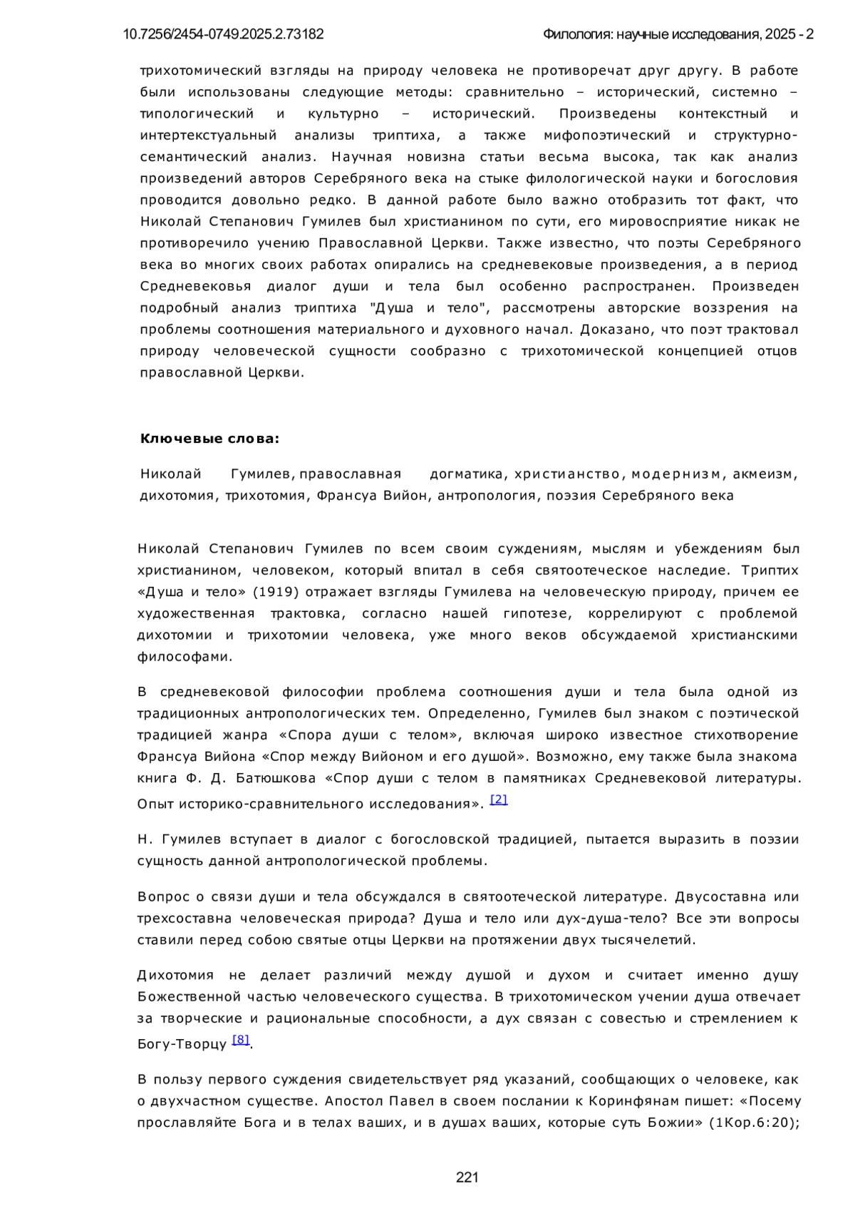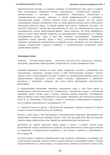 Николай Степанович Гумилев по всем своим суждениям, мыслям и убеждениям был христианином, человеком, который впитал в себя святоотеческое наследие. Триптих «Душа и тело» (1919) отражает взгляды Гумилева на человеческую природу, причем ее художественная трактовка, согласно нашей гипотезе, коррелируют с проблемой дихотомии и трихотомии человека, уже много веков обсуждаемой христианскими философами.