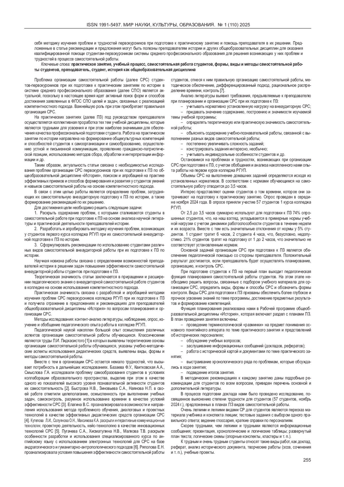 Проблема организации самостоятельной работы (далее СРС) студентов-первокурсников при их подготовке к практическим занятиям по истории в системе среднего профессионального образования (далее СПО) является актуальной, поскольку в настоящее время идет активный поиск форм и способов достижения заявленных в ФГОС СПО целей и задач, связанных с реализацией компетентностного подхода. Важнейшую роль при этом приобретает правильная организация СРС.