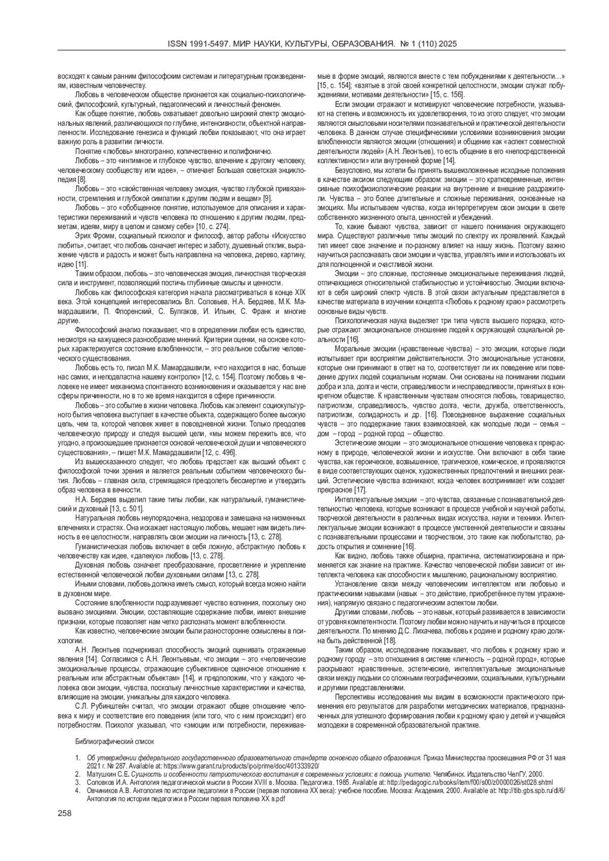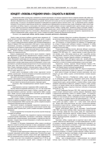 Формирование любви к родному краю, понимание ее, познание окружающего с ее помощью социального бытия и совершенствование себя требует продолжительных временных затрат Результативность реализации данного процесса зависит от качества его осуществления, использования общих средств обучения в образовательных организациях различных уровней. Такой целостности можно достичь при сохранении единых подходов к категории «любовь к родному краю». Актуальность исследования определяется необходимостью разработки данного понятия в связи с тем, что образование детей и учащейся молодежи в России является национальным приоритетом, направленным на формирование поколения молодых людей, обладающих такими личностными качествами, как любовь и гордость за свою родину, ответственность за ее судьбу, уважение к культуре и традициям своего и других народов страны и мира. В статье приводятся результаты междисциплинарного научного анализа понятия «любовь к родному краю», выявляется сущность категории «любовь к родному краю» и обосновывается значимость формирования любви к родному краю у детей и учащейся молодежи как явления образовательной практики. Представленный материал может быть использован в образовательных учреждениях для разработки методических материалов, предназначенных для успешного формирования любви к родному краю у детей и учащейся молодежи в современной образовательной практике.