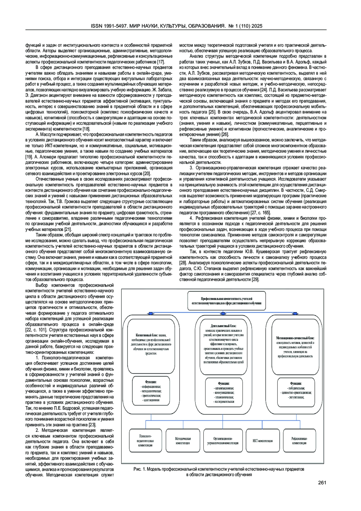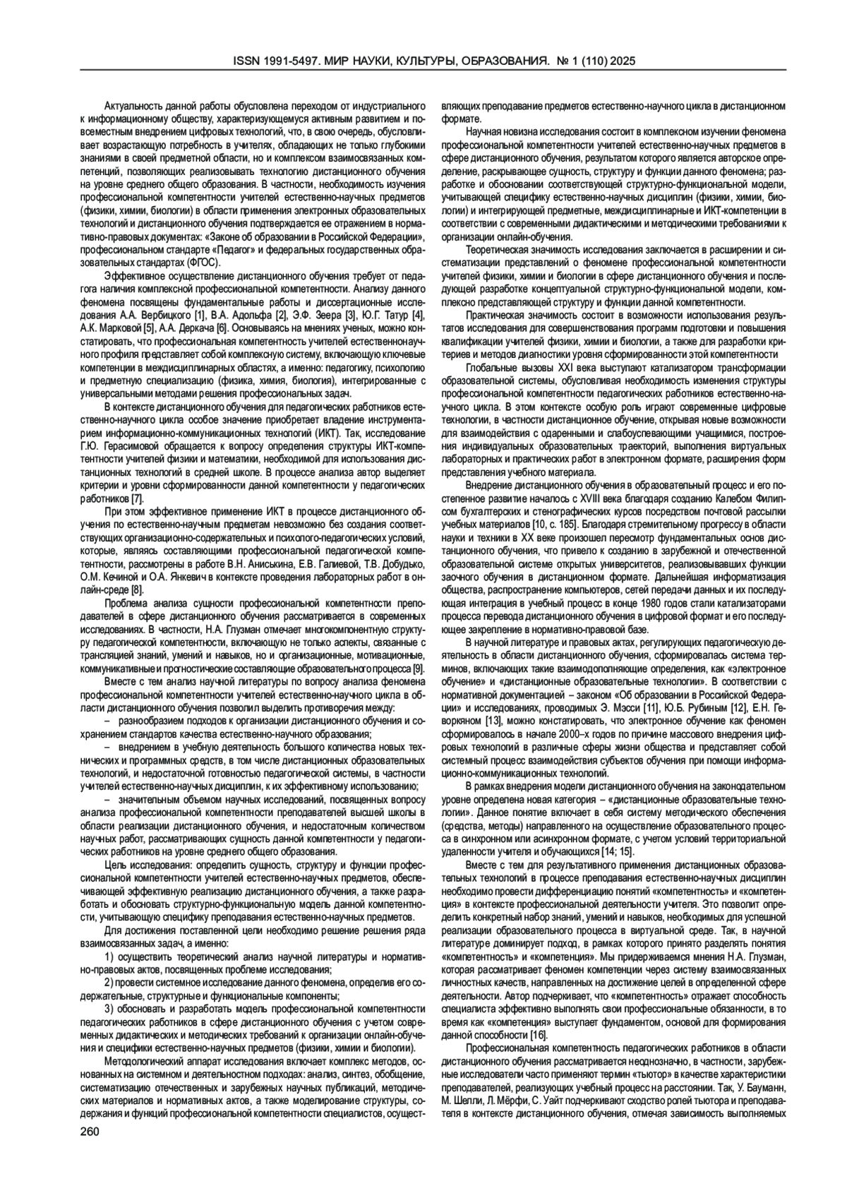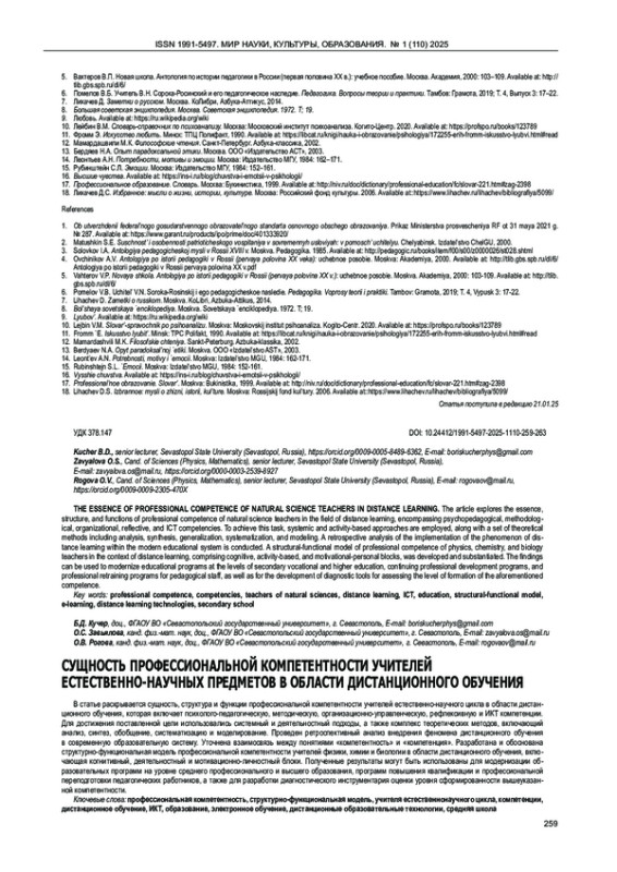 В статье раскрывается сущность, структура и функции профессиональной компетентности учителей естественно-научного цикла в области дистанционного обучения, которая включает психолого-педагогическую, методическую, организационно-управленческую, рефлексивную и ИКТ компетенции. Для достижения поставленной цели использовались системный и деятельностный подходы, а также комплекс теоретических методов, включающий анализ, синтез, обобщение, систематизацию и моделирование. Проведен ретроспективный анализ внедрения феномена дистанционного обучения в современную образовательную систему. Уточнена взаимосвязь между понятиями «компетентность» и «компетенция». Разработана и обоснована структурно-функциональная модель профессиональной компетентности учителей физики, химии и биологии в области дистанционного обучения, включающая когнитивный, деятельностный и мотивационно-личностный блоки. Полученные результаты могут быть использованы для модернизации образовательных программ на уровне среднего профессионального и высшего образования, программ повышения квалификации и профессиональной переподготовки педагогических работников, а также для разработки диагностического инструментария оценки уровня сформированности вышеуказанной компетентности.
