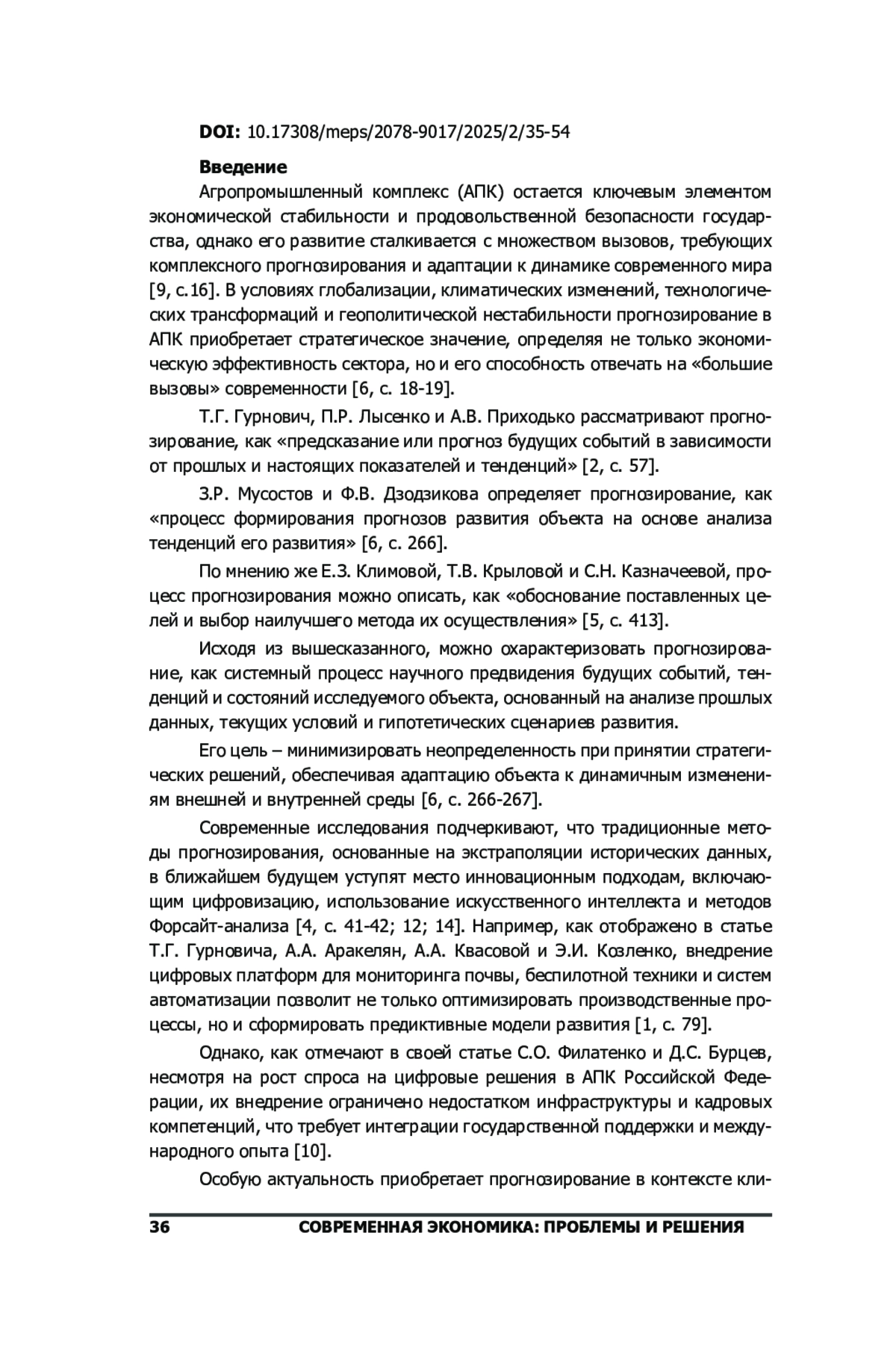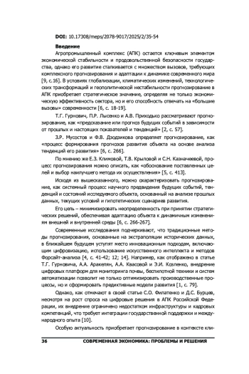 1. Гурнович Т.Г., Аракелян А.А., Квасова А.А., Козленко Э.И. Трансформация процесса прогнозирования деятельности предприятий АПК в период возрастания роли высокотехнологического производства // Вестник Академии знаний, 2022, no. 53 (6), с. 73-79. EDN: TVTEZH