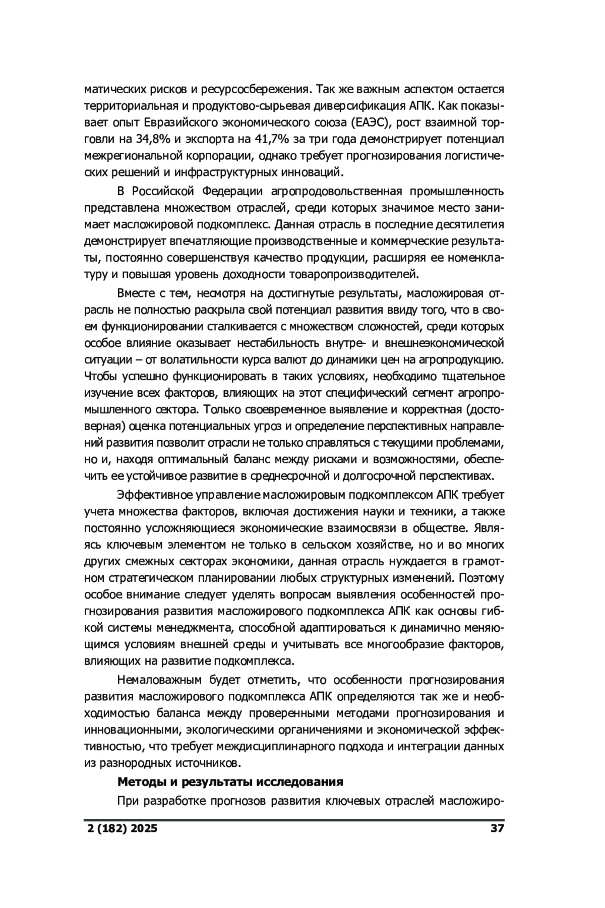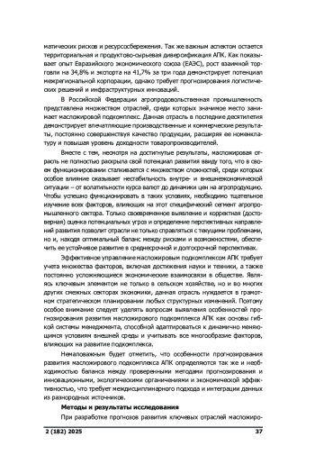 В Российской Федерации агропродовольственная промышленность представлена множеством отраслей, среди которых значимое место занимает масложировой подкомплекс. Данная отрасль в последние десятилетия демонстрирует впечатляющие производственные и коммерческие результаты, постоянно совершенствуя качество продукции, расширяя ее номенклатуру и повышая уровень доходности товаропроизводителей. Вместе с тем, несмотря на достигнутые результаты, масложировая отрасль не полностью раскрыла свой потенциал развития ввиду того, что в своем функционировании сталкивается с множеством сложностей, среди которых особое влияние оказывает нестабильность внутре- и внешнеэкономической ситуации – от волатильности курса валют до динамики цен на агропродукцию. Чтобы успешно функционировать в таких условиях, необходимо тщательное изучение всех факторов, влияющих на этот специфический сегмент агропромышленного сектора. Только своевременное выявление и корректная (достоверная) оценка потенциальных угроз и определение перспективных направлений развития позволит отрасли не только справляться с текущими проблемами, но и, находя оптимальный баланс между рисками и возможностями, обеспечить ее устойчивое развитие в среднесрочной и долгосрочной перспективах.