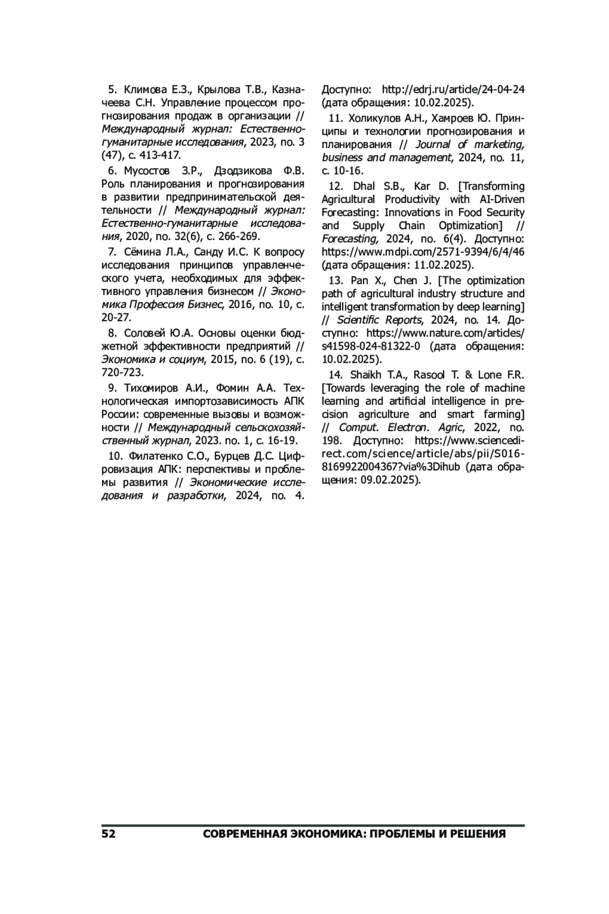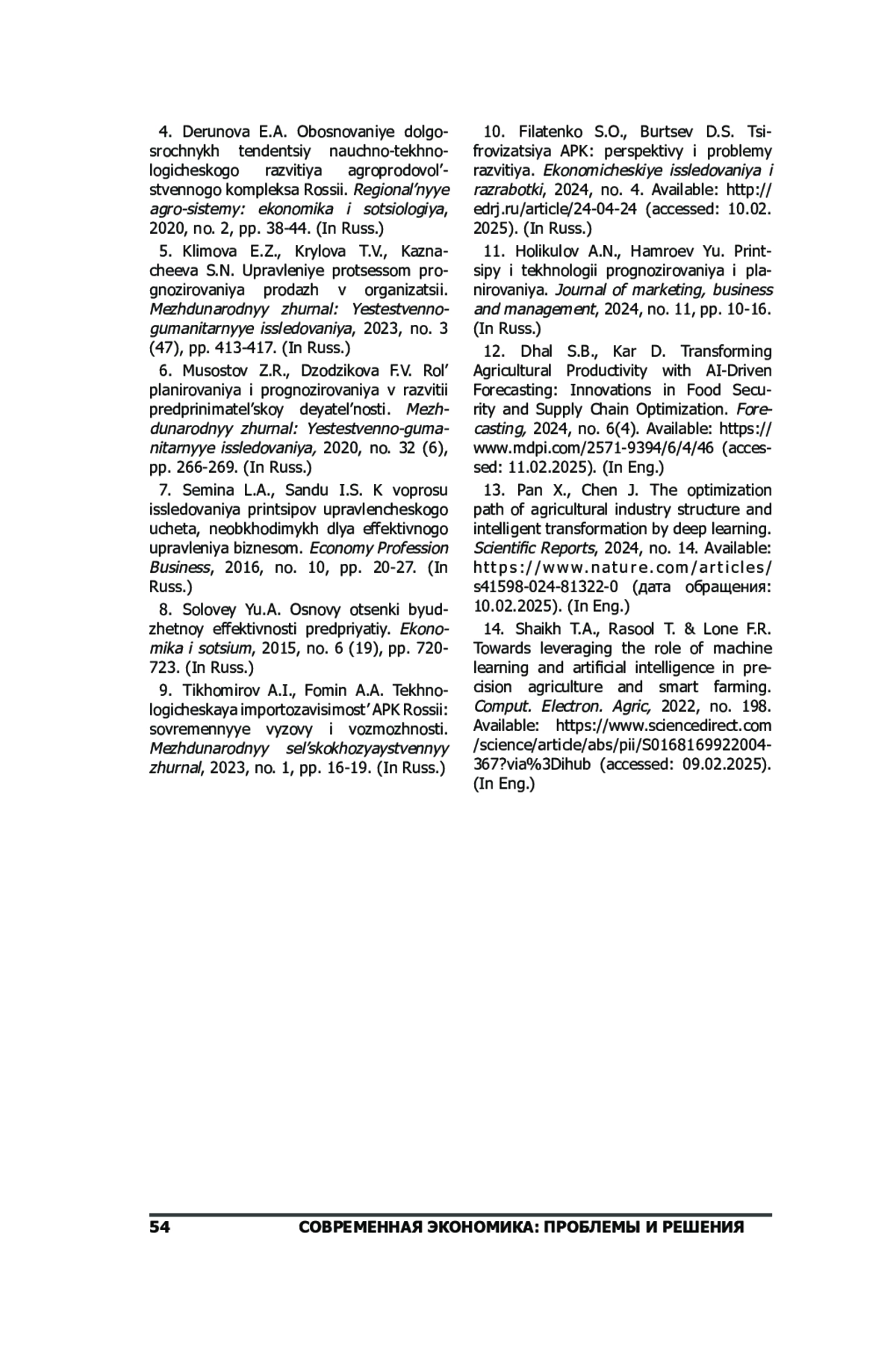 12. Dhal S.B., Kar D. [Transforming Agricultural Productivity with AI-Driven Forecasting: Innovations in Food Security and Supply Chain Optimization] // Forecasting, 2024, no. 6(4). Доступно: https://www.mdpi.com/2571-9394/6/4/46 (дата обращения: 11.02.2025).