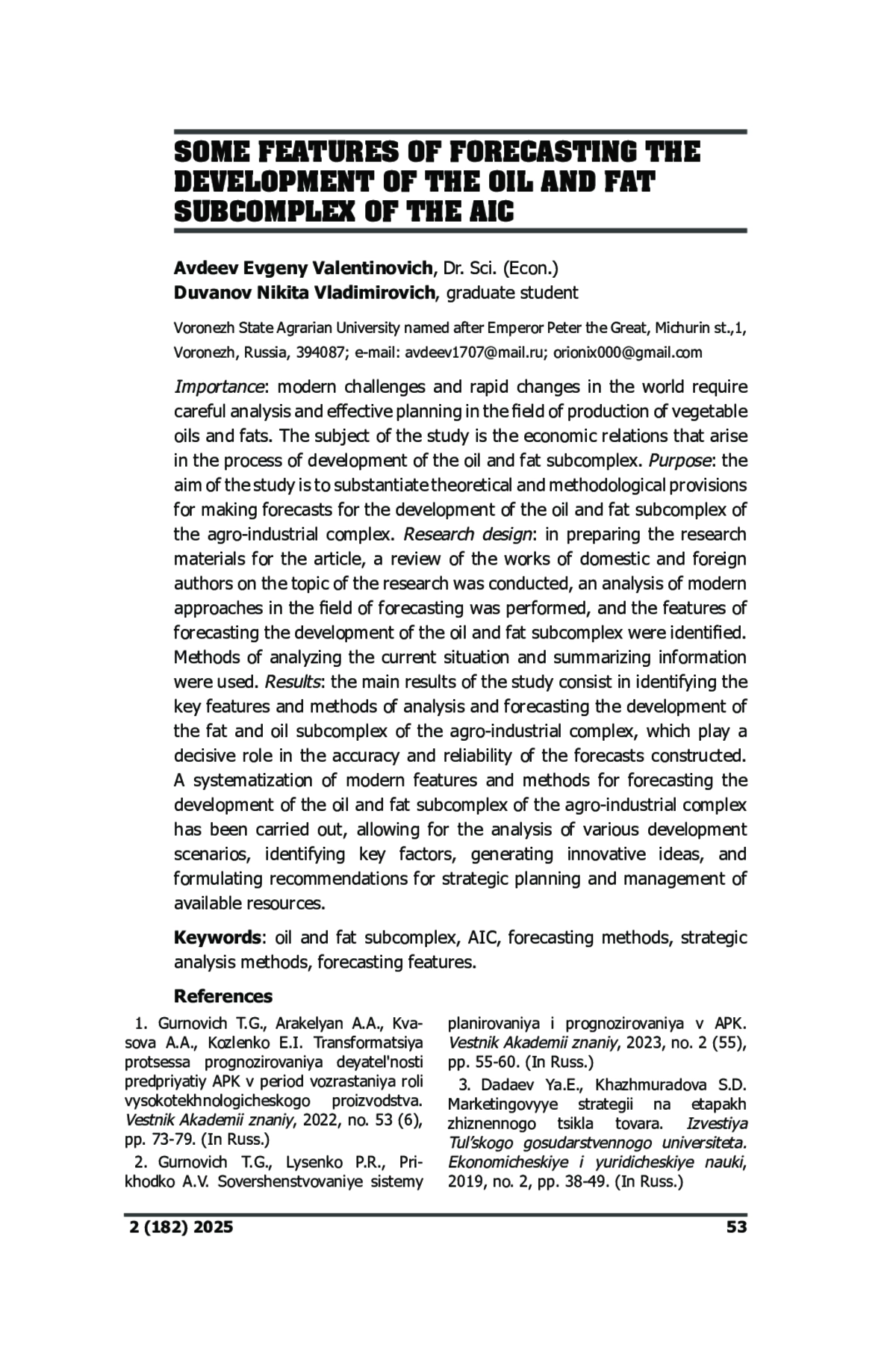 2. Гурнович Т.Г., Лысенко П.Р., Приходько А.В. Совершенствование системы планирования и прогнозирования в АПК // Вестник Академии знаний, 2023, no. 2 (55), с. 55-60. EDN: GHPUYN