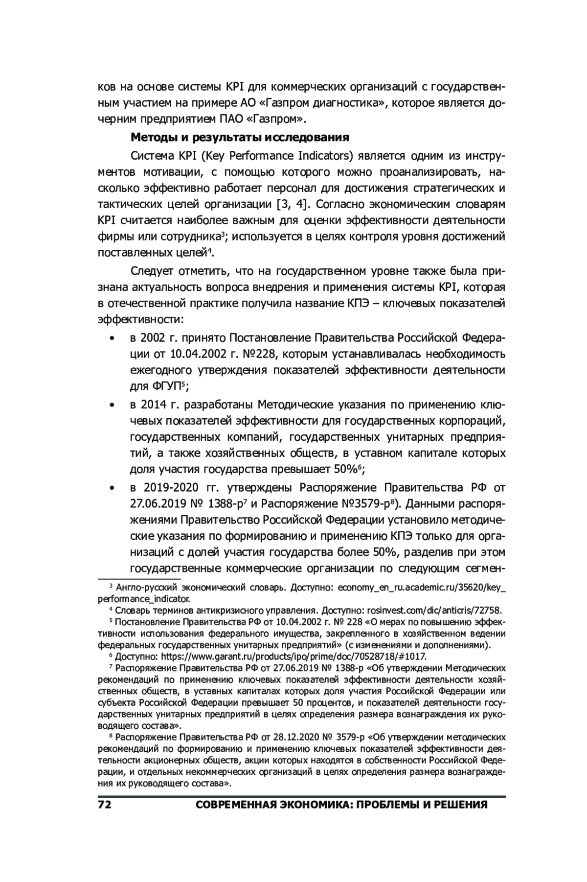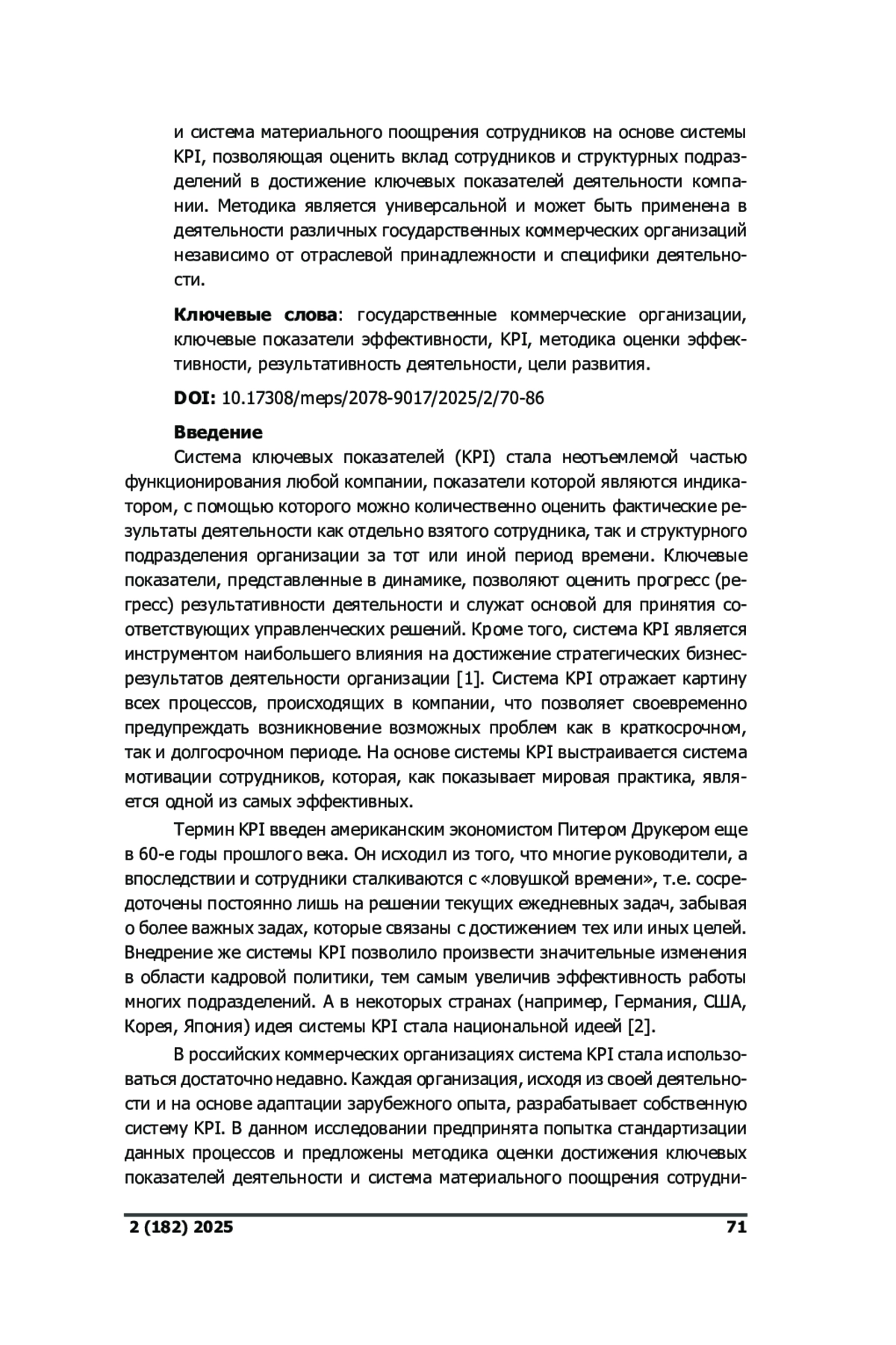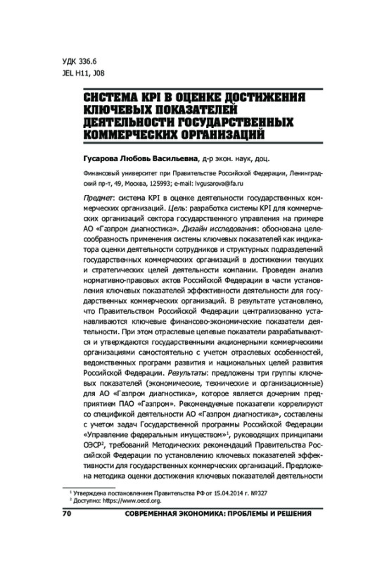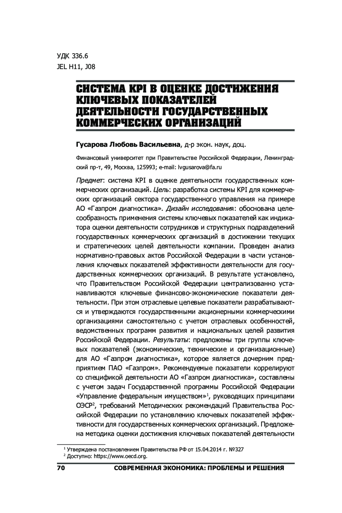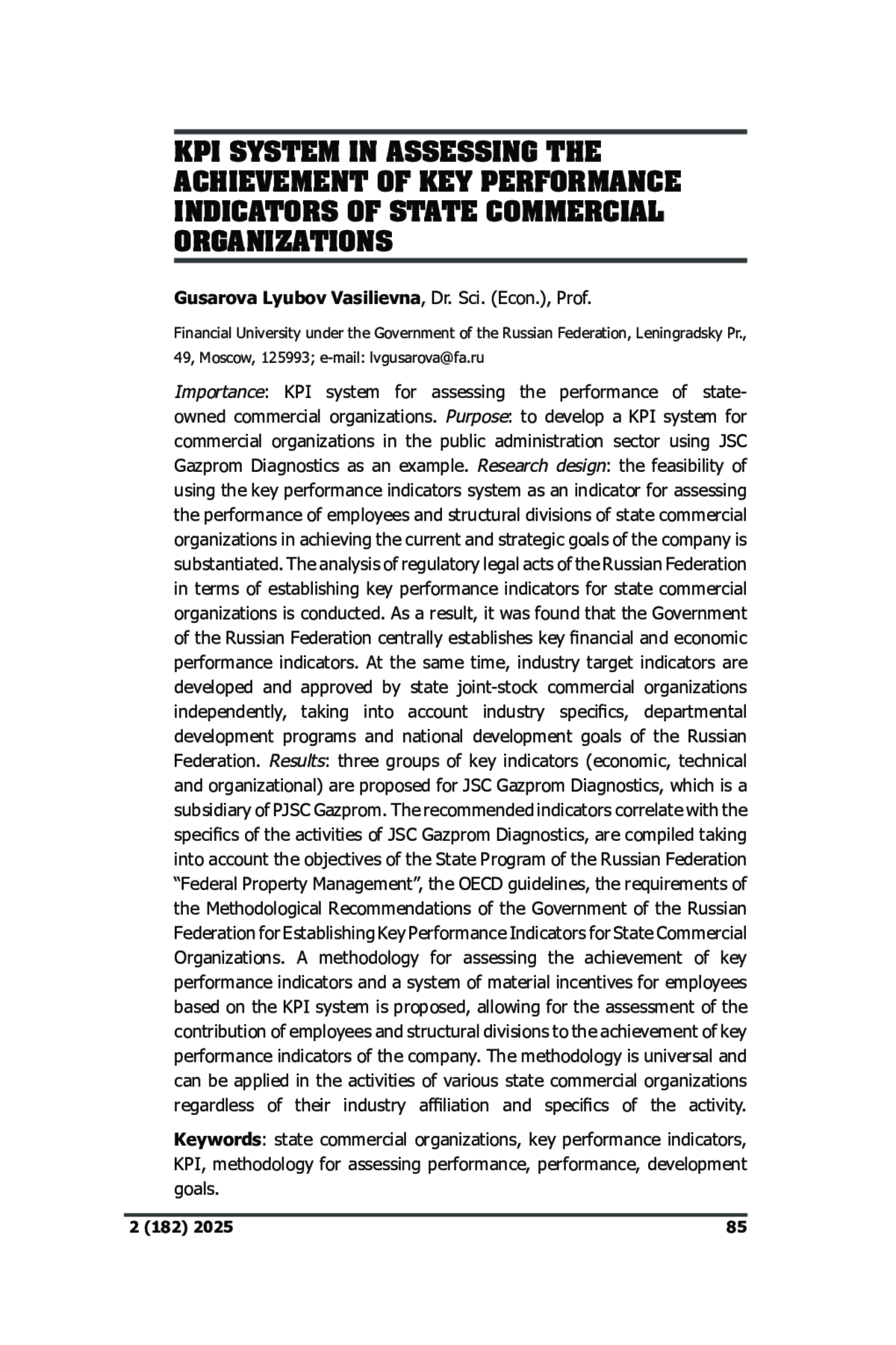 Предмет: система KPI в оценке деятельности государственных коммерческих организаций. Цель: разработка системы KPI для коммерческих организаций сектора государственного управления на примере АО «Газпром диагностика». Дизайн исследования: обоснована целесообразность применения системы ключевых показателей как индикатора оценки деятельности сотрудников и структурных подразделений государственных коммерческих организаций в достижении текущих и стратегических целей деятельности компании. Проведен анализ нормативно-правовых актов Российской Федерации в части установления ключевых показателей эффективности деятельности для государственных коммерческих организаций. В результате установлено, что Правительством Российской Федерации централизованно устанавливаются ключевые финансово-экономические показатели деятельности. При этом отраслевые целевые показатели разрабатываются и утверждаются государственными акционерными коммерческими организациями самостоятельно с учетом отраслевых особенностей, ведомственных программ развития и национальных целей развития Российской Федерации. Результаты: предложены три группы ключевых показателей (экономические, технические и организационные) для АО «Газпром диагностика», которое является дочерним предприятием ПАО «Газпром». Рекомендуемые показатели коррелируют со спецификой деятельности АО «Газпром диагностика», составлены с учетом задач Государственной программы Российской Федерации «Управление федеральным имуществом»[10], руководящих принципами ОЭСР2, требований Методических рекомендаций Правительства Российской Федерации по установлению ключевых показателей эффективности для государственных коммерческих организаций. Предложена методика оценки достижения ключевых показателей деятельности и система материального поощрения сотрудников на основе системы KPI, позволяющая оценить вклад сотрудников и структурных подразделений в достижение ключевых показателей деятельности компании. Методика является универсальной и может быть применена в деятельности различных государственных коммерческих организаций независимо от отраслевой принадлежности и специфики деятельности.