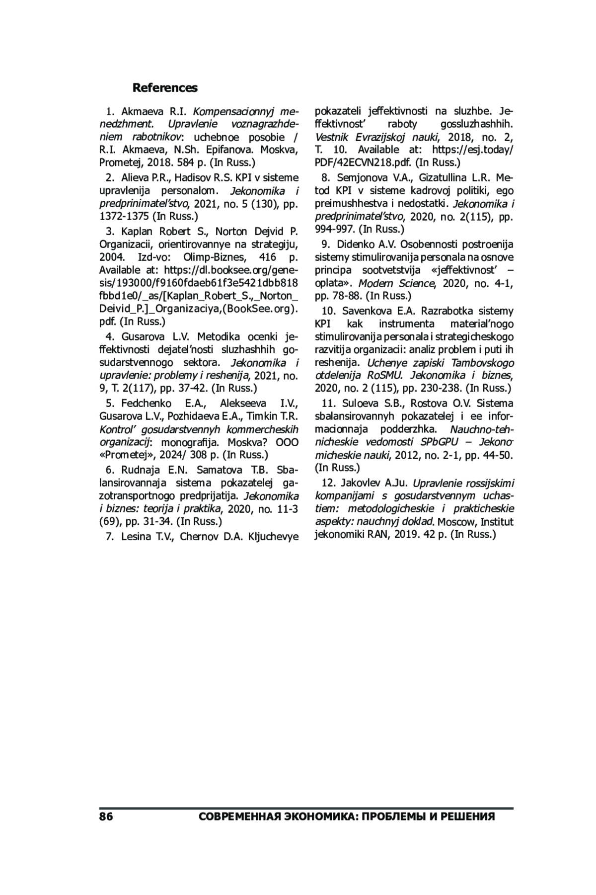 7. 	Лесина Т.В., Чернов Д.А. Ключевые показатели эффективности на службе. Эффективность работы госслужащих // Вестник Евразийской науки, 2018, no. 2, т. 10. Доступно: https://esj.today/PDF/42ECVN218.pdf. EDN: XSDEKD