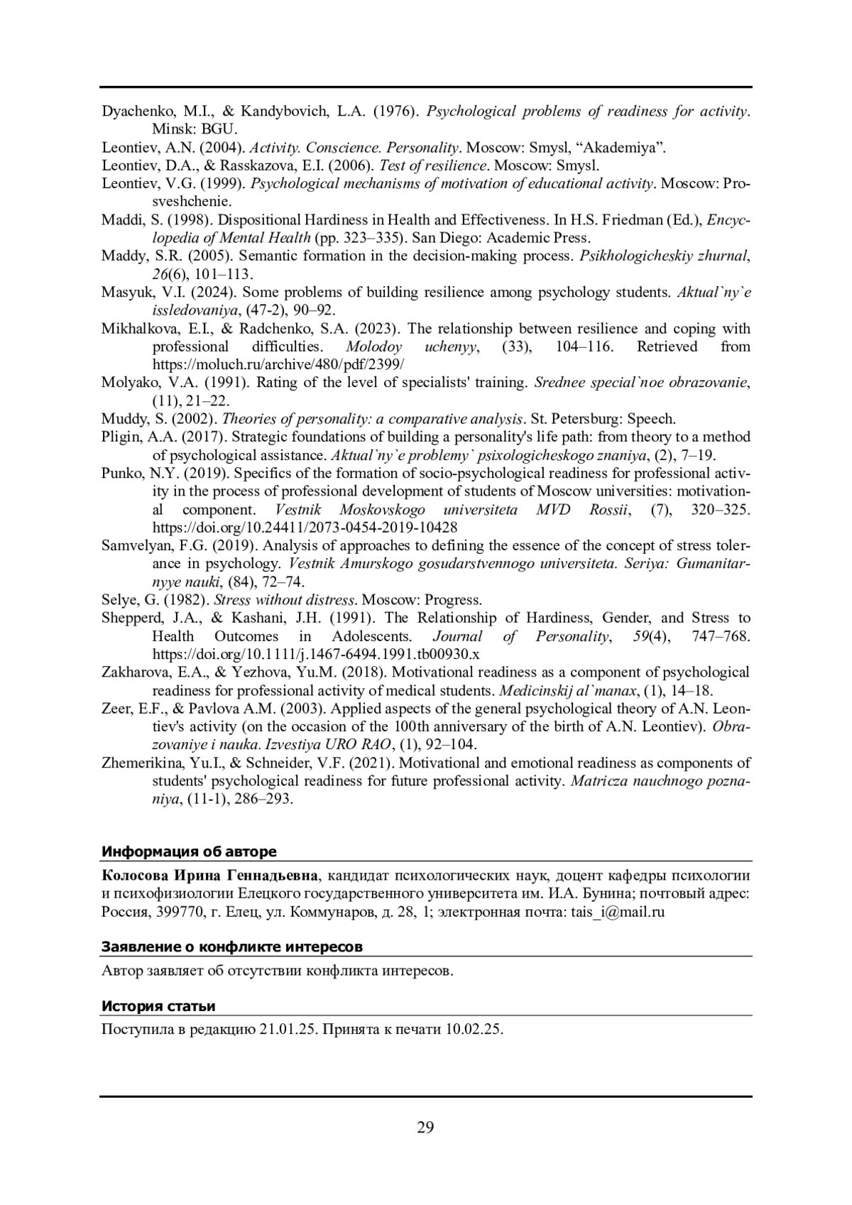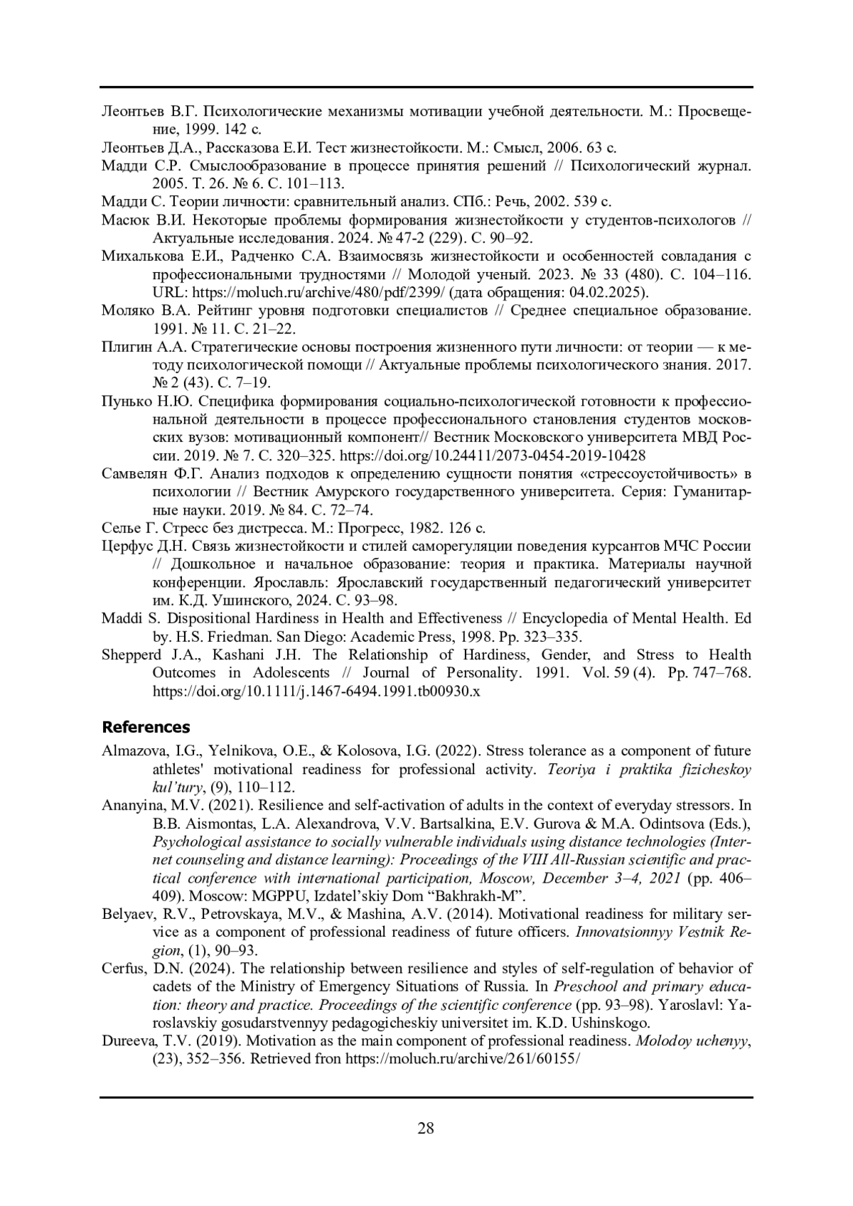22. Maddi S. Dispositional Hardiness in Health and Effectiveness // Encyclopedia of Mental Health. Ed by. H.S. Friedman. San Diego: Academic Press, 1998. Pp. 323-335.