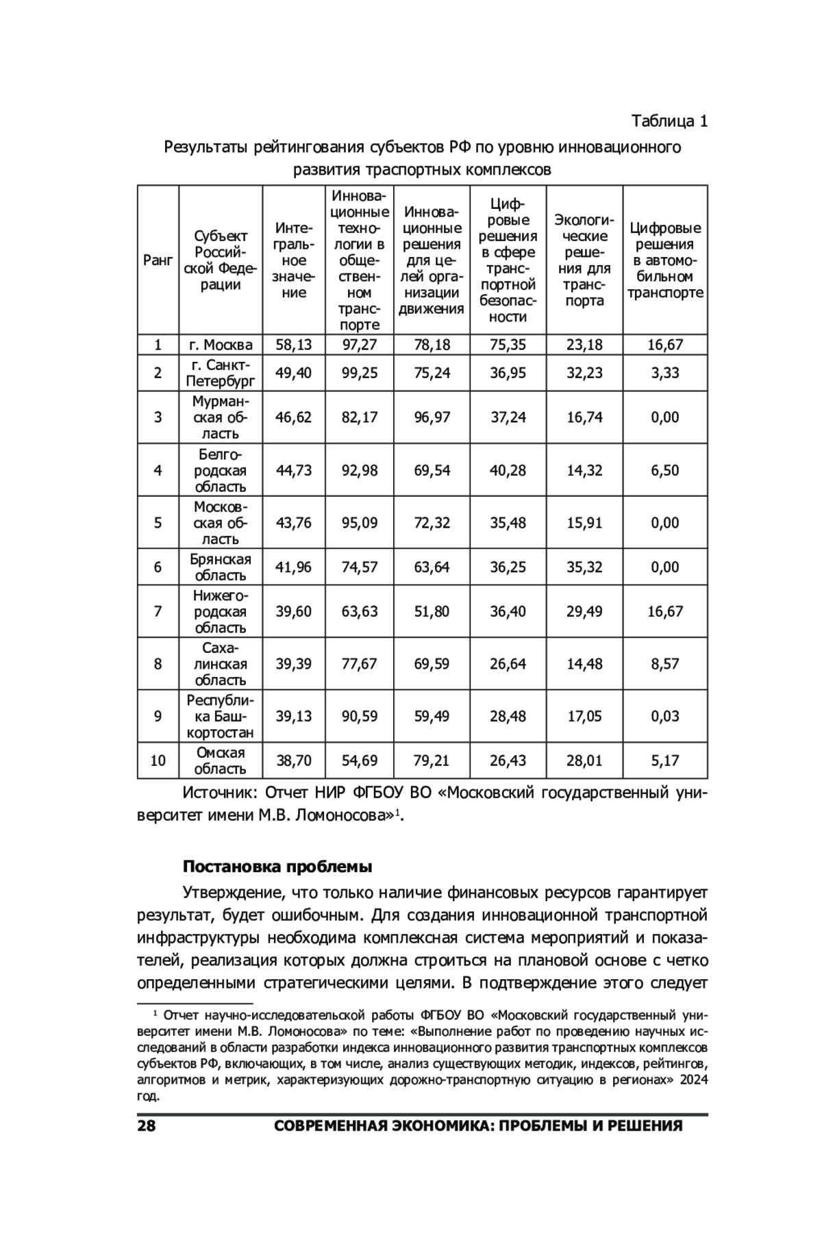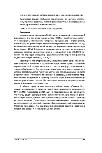 Транспорт и транспортные коммуникации являются одной из важнейших отраслей в экономике и социальной сфере любой страны. Основными параметрами этой отрасли являются – скорость, комфорт, экономичность, энергоэффективность. Для улучшения характеристики данных параметров сегодня разрабатываются такие технологии, как левитационные, в качестве энергетических – установки и технологии на водороде, электричестве, ядерном топливе. Внедряются в практику опытные образцы высокоинтеллектуальных транспортных средств. Москва является лидером в стране по интенсивности инновационных процессов.
