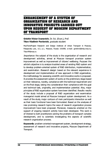 Предмет, организация научно-исследовательских и опытноконструкторских работ в целях совершенствования транспортного обеспечения города Москвы и повышения уровня благосостояния жителей города. Цель: проанализировать проблемные области существующей системы организации и проведения научно-технической политики транспортного комплекса города Москвы и разработать проблемно ориентированную систему распределения, выполнения и экспертизы соответствующих НИОКР. Дизайн исследования: на основе изложения опыта разработки и внедрения нового подхода к организации соответствующих исследований предложена методология оценки научных и инновационных работ на входе (актуальность, новизна, соответствие технического задания цели и сложности заявленной работы) и выходе (соответствие поставленным целям и техническому заданию, новизна и возможность внедрения). Выявлены и сформулированы основные принципы организации научноисследовательской работы. Результаты: предложена управленческая модель организации и экспертизы научно-технических работ, проводимых в интересах развития транспортного комплекса города Москвы. Описаны основные контуры взаимодействия и базовый функционал участников системы. Проанализирована перспективная тематика проводимых исследований и предложены направления ее совершенствования. На основе анализа ресурсного обеспечения выполнения программы разработаны меры поддержки проводимых мероприятий. Работа может быть интересна как практикам, занимающимся проблемами развития транспортного комплекса, так и ученым, изучающим вопросы организации научных исследований.