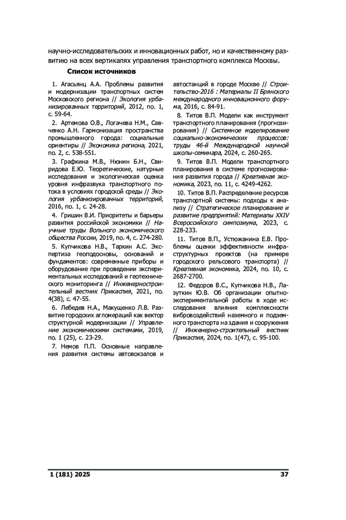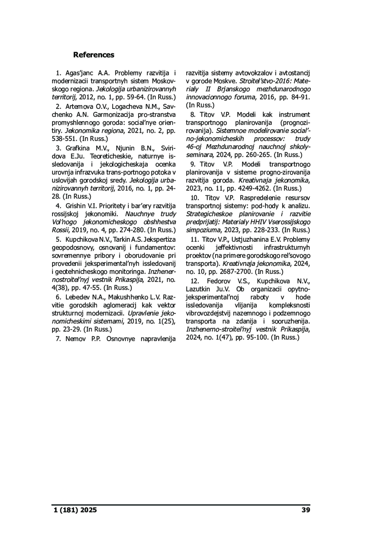1. 	Агасьянц А.А. Проблемы развития и модернизации транспортных систем Московского региона // Экология урбанизированных территорий, 2012, no. 1, c. 59-64. EDN: PAMKDJ