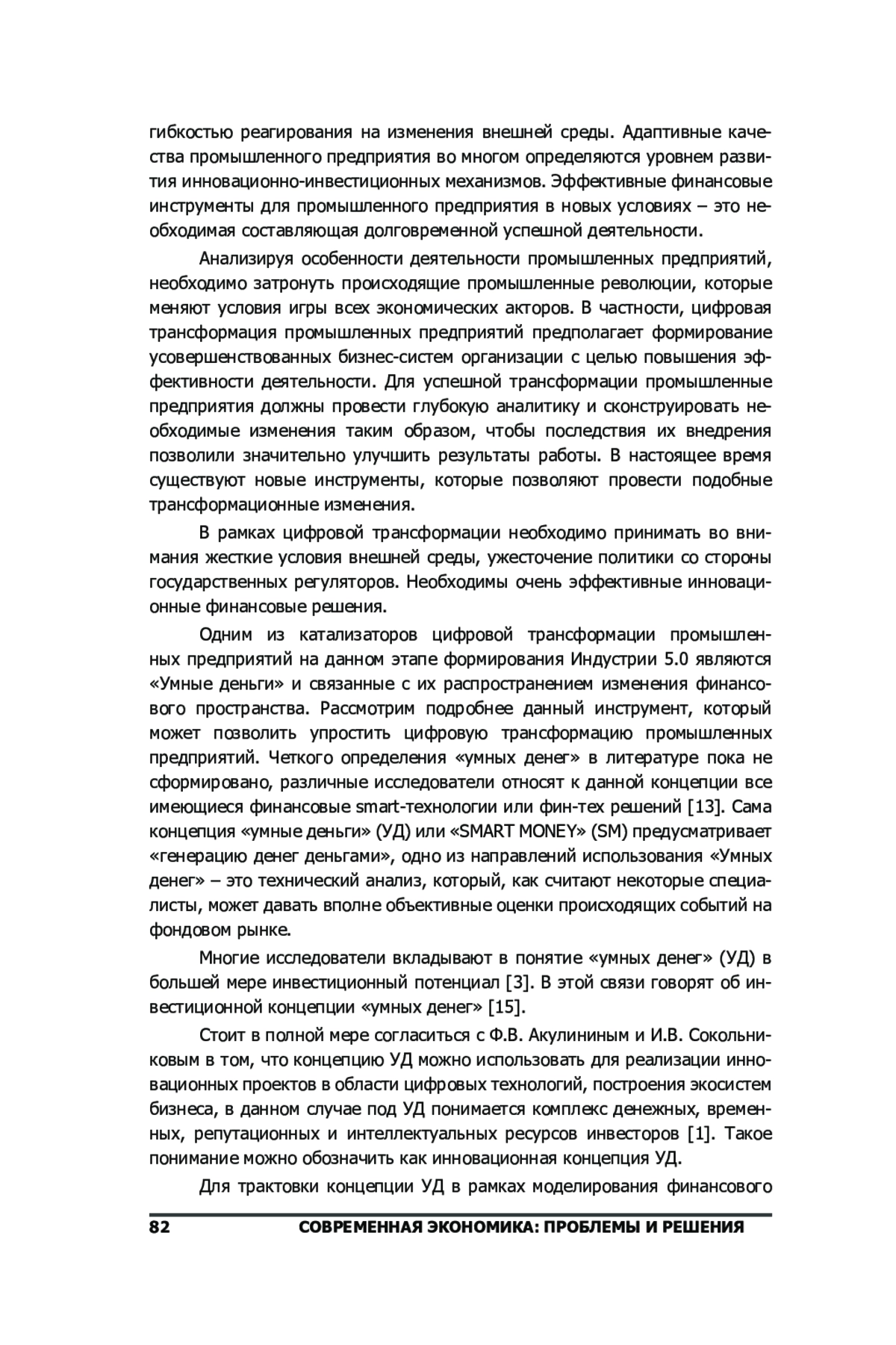 1. 	Акулинин Ф.В., Сокольникова И.В. Концепция “умные деньги” и инвестирование в инновационные проекты в области цифровых технологий // Транспортное дело России, 2020, no. 6, с. 55-59. EDN: VPFTSK