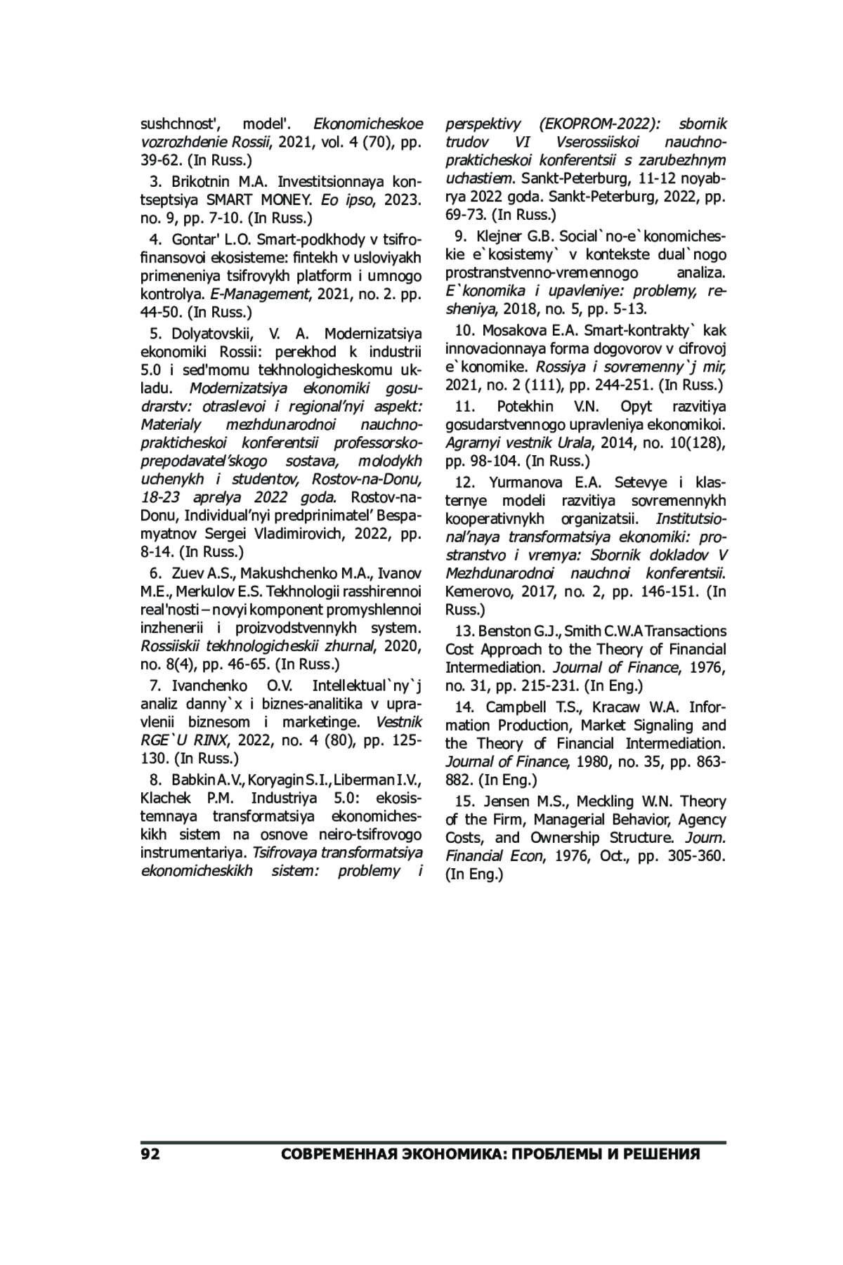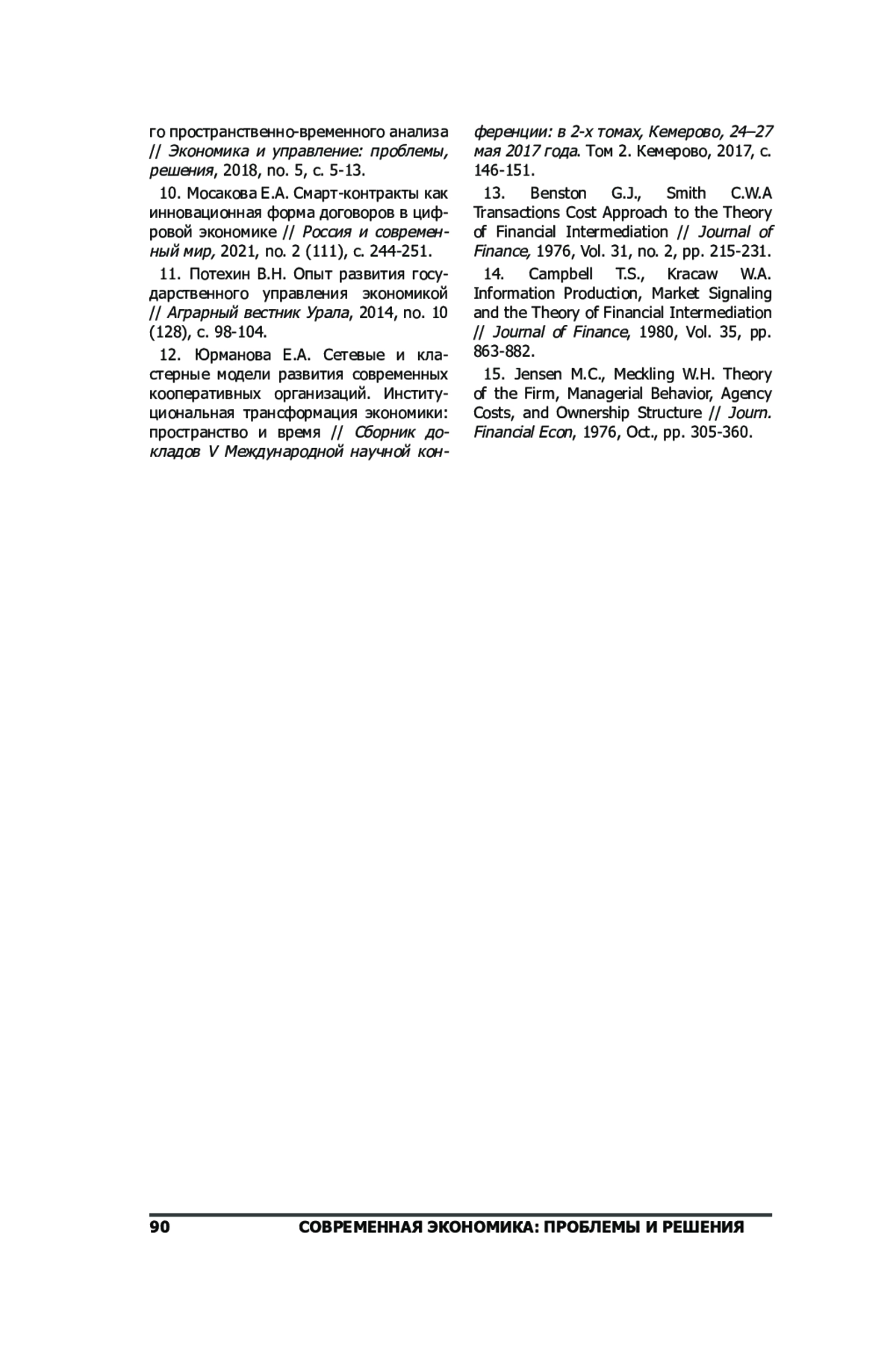 15. 	Jensen М.С., Meckling W.H. Theory of the Firm, Managerial Behavior, Agency Costs, and Ownership Structure // Journ. Financial Econ, 1976, Oct., pp. 305-360.