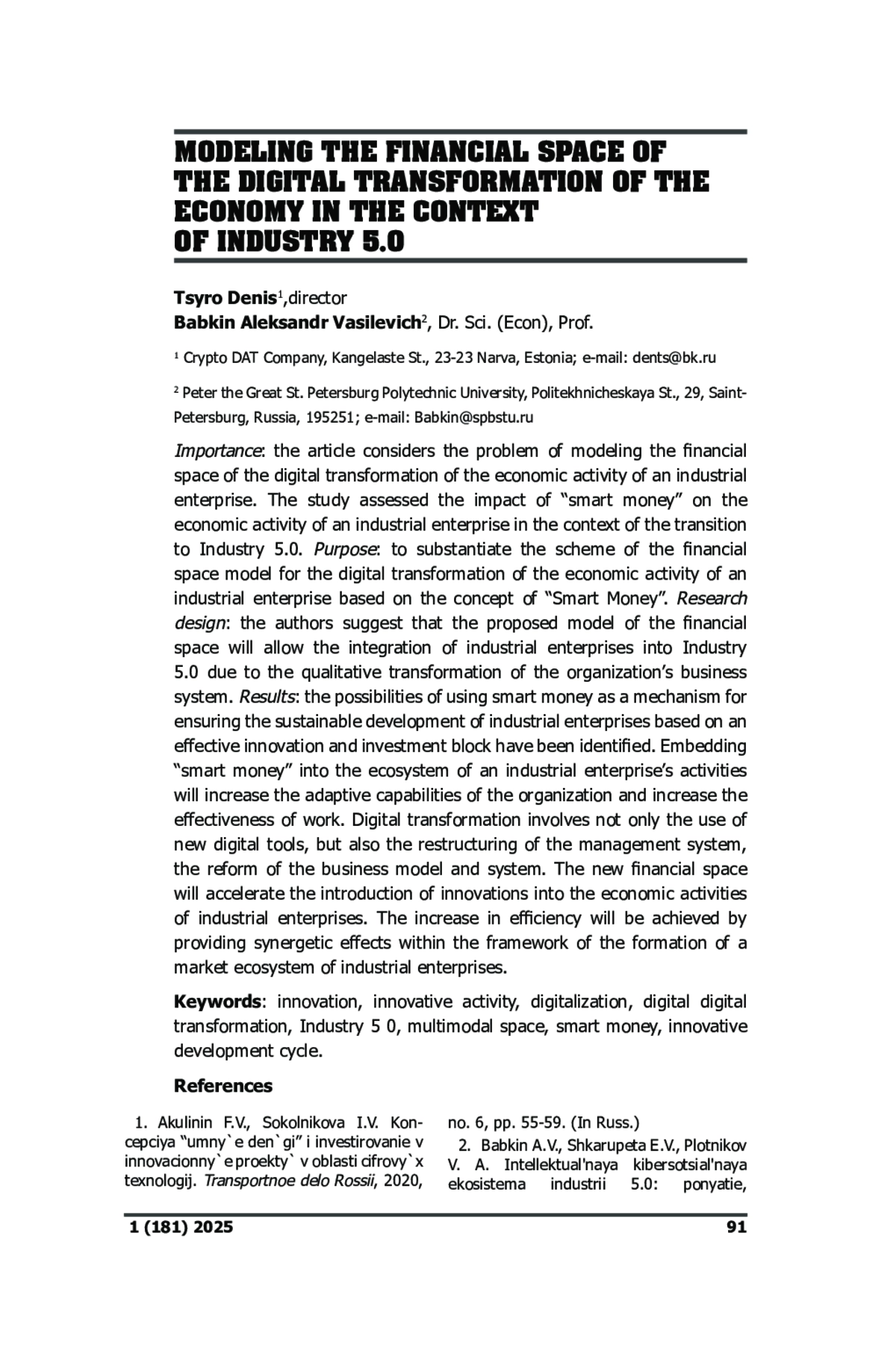 3. 	Бабкин А.В., Шкарупета Е.В., Плотников В.А. Интеллектуальная киберсоциальная экосистема индустрии 5.0: понятие, сущность, модель // Экономическое возрождение России, 2021, no. 4 (70), с. 39-62. EDN: TCYAIR