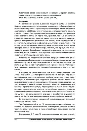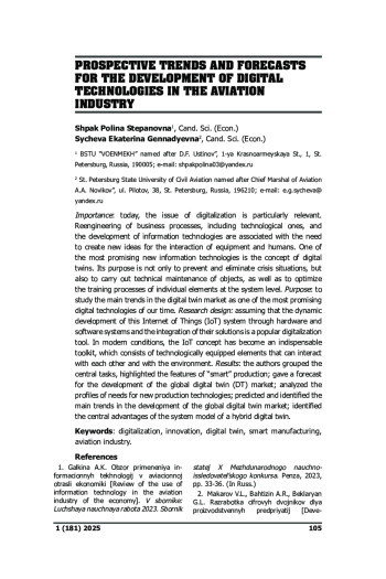 Титов Д. Е. и Кобзистая М. В. [7] также отмечают высокую значимость исследования актуальных цифровых технологий, упоминая широкий спектр возможностей их применения и использования; возможность разработки самообучающихся технологий. Макаров В. Л., Бахтизин А. Р. и Бекларян Г. Л. [2] подчеркивают особую значимость такой цифровой технологии, как имитационное моделирование, благодаря которому появилась возможность совмещения разрабатываемых моделей с базами данных и хранилищами данных, в том числе в авиационной промышленности.