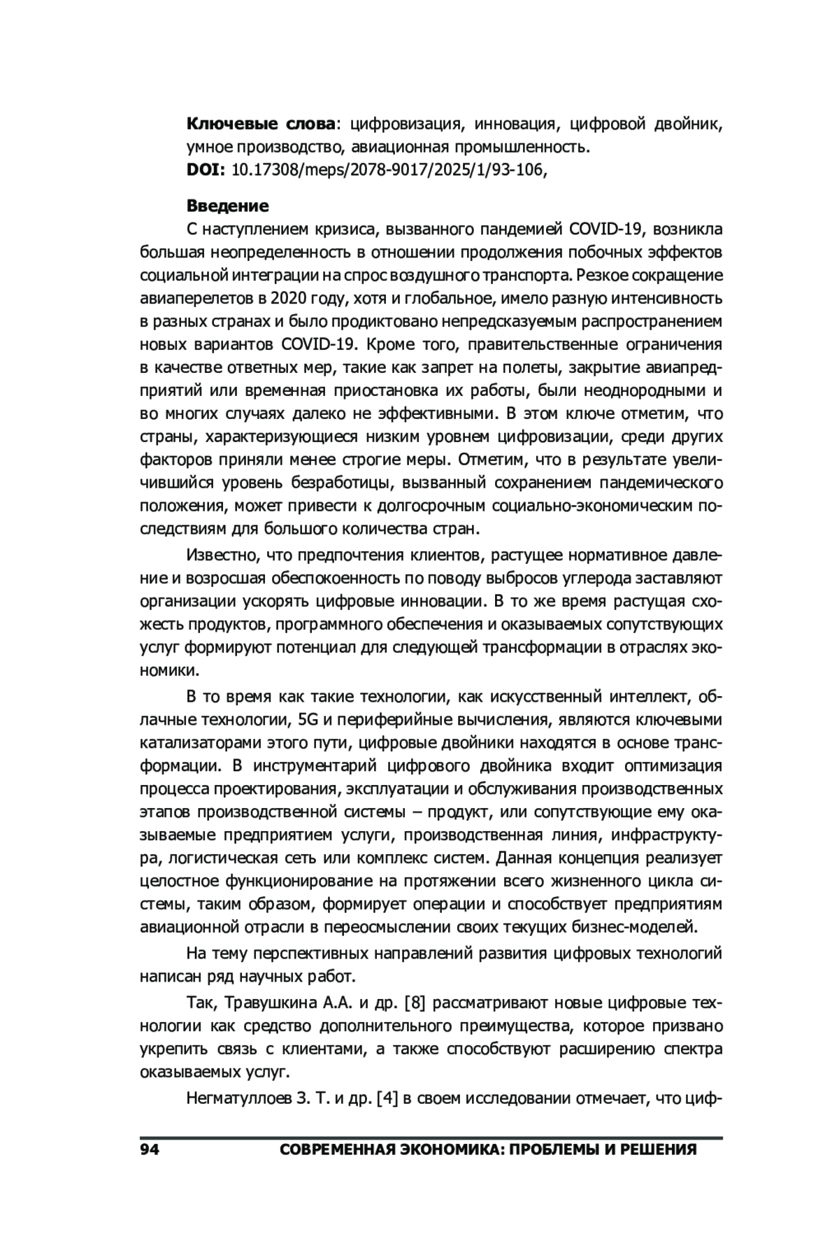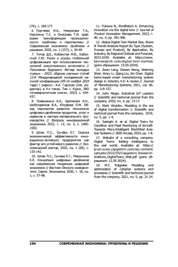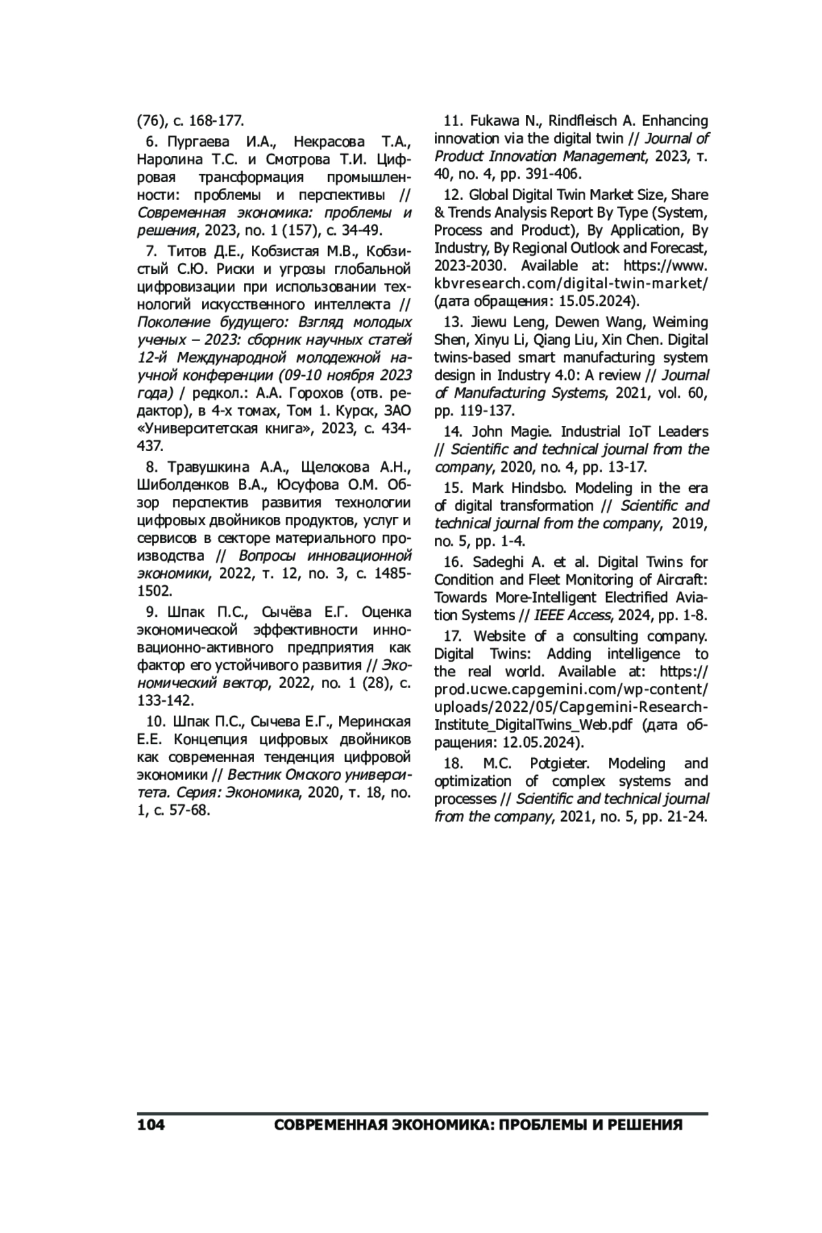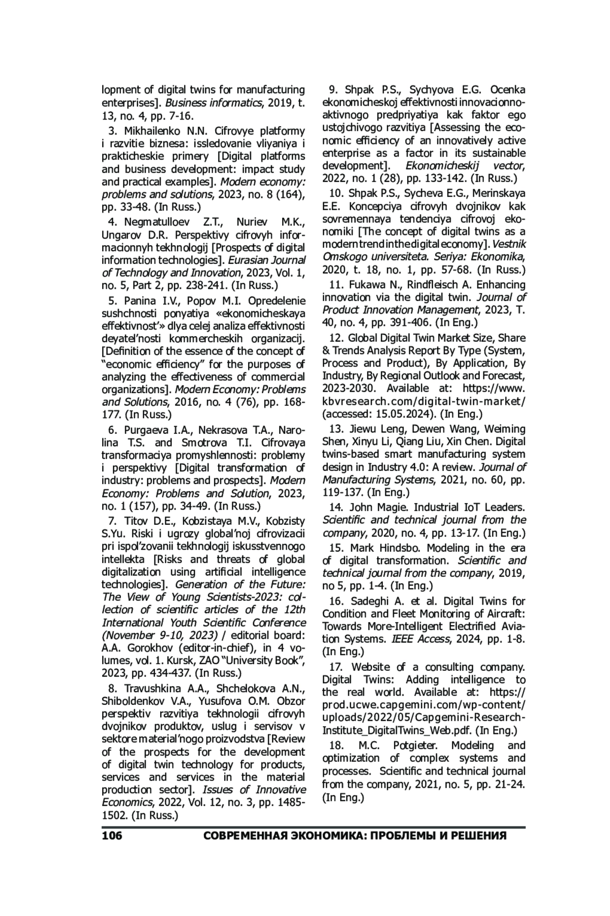 8. 	Травушкина А.А., Щелокова А.Н., Шиболденков В.А., Юсуфова О.М. Обзор перспектив развития технологии цифровых двойников продуктов, услуг и сервисов в секторе материального производства // Вопросы инновационной экономики, 2022, т. 12, no. 3, с. 14851502. EDN: ATGWEZ