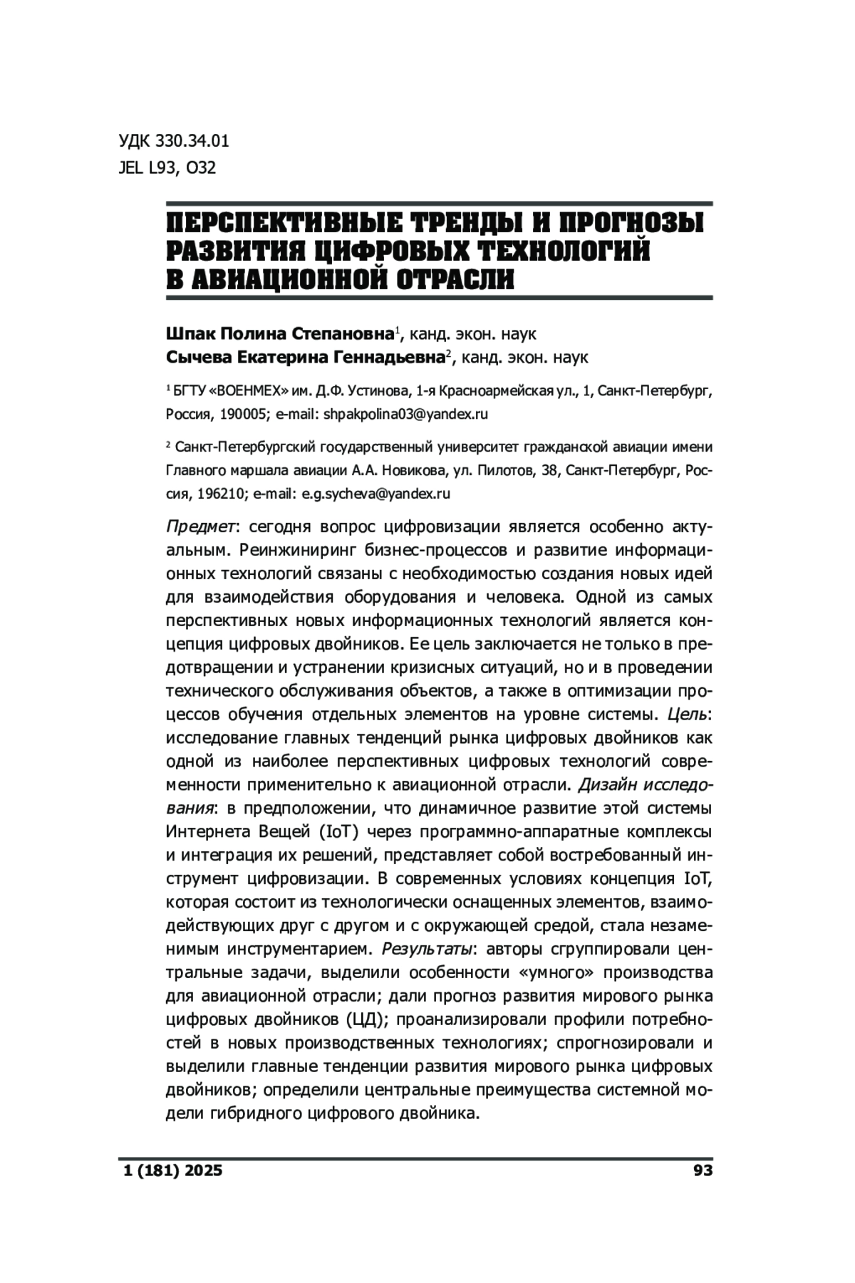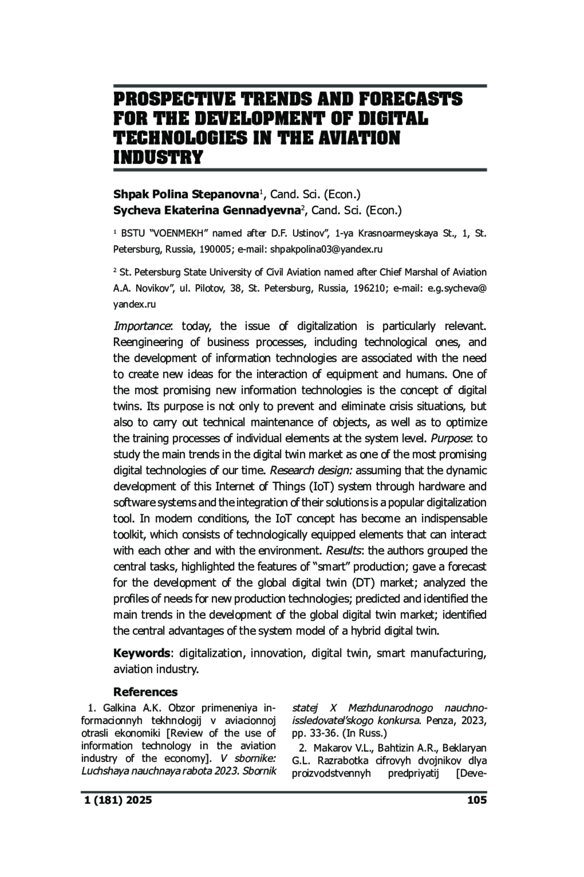 Предмет: сегодня вопрос цифровизации является особенно актуальным. Реинжиниринг бизнес-процессов и развитие информационных технологий связаны с необходимостью создания новых идей для взаимодействия оборудования и человека. Одной из самых перспективных новых информационных технологий является концепция цифровых двойников. Ее цель заключается не только в предотвращении и устранении кризисных ситуаций, но и в проведении технического обслуживания объектов, а также в оптимизации процессов обучения отдельных элементов на уровне системы. Цель: исследование главных тенденций рынка цифровых двойников как одной из наиболее перспективных цифровых технологий современности применительно к авиационной отрасли. Дизайн исследования: в предположении, что динамичное развитие этой системы Интернета Вещей (IoT) через программно-аппаратные комплексы и интеграция их решений, представляет собой востребованный инструмент цифровизации. В современных условиях концепция IoT, которая состоит из технологически оснащенных элементов, взаимодействующих друг с другом и с окружающей средой, стала незаменимым инструментарием. Результаты: авторы сгруппировали центральные задачи, выделили особенности «умного» производства для авиационной отрасли; дали прогноз развития мирового рынка цифровых двойников (ЦД); проанализировали профили потребностей в новых производственных технологиях; спрогнозировали и выделили главные тенденции развития мирового рынка цифровых двойников; определили центральные преимущества системной модели гибридного цифрового двойника.