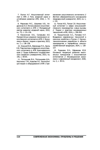 7. Лузгин Н.Г. Искусственный интеллект в АПК // Роль аграрной науки в устойчивом развитии АПК, 2022, с. 7277. EDN: DFLAMJ