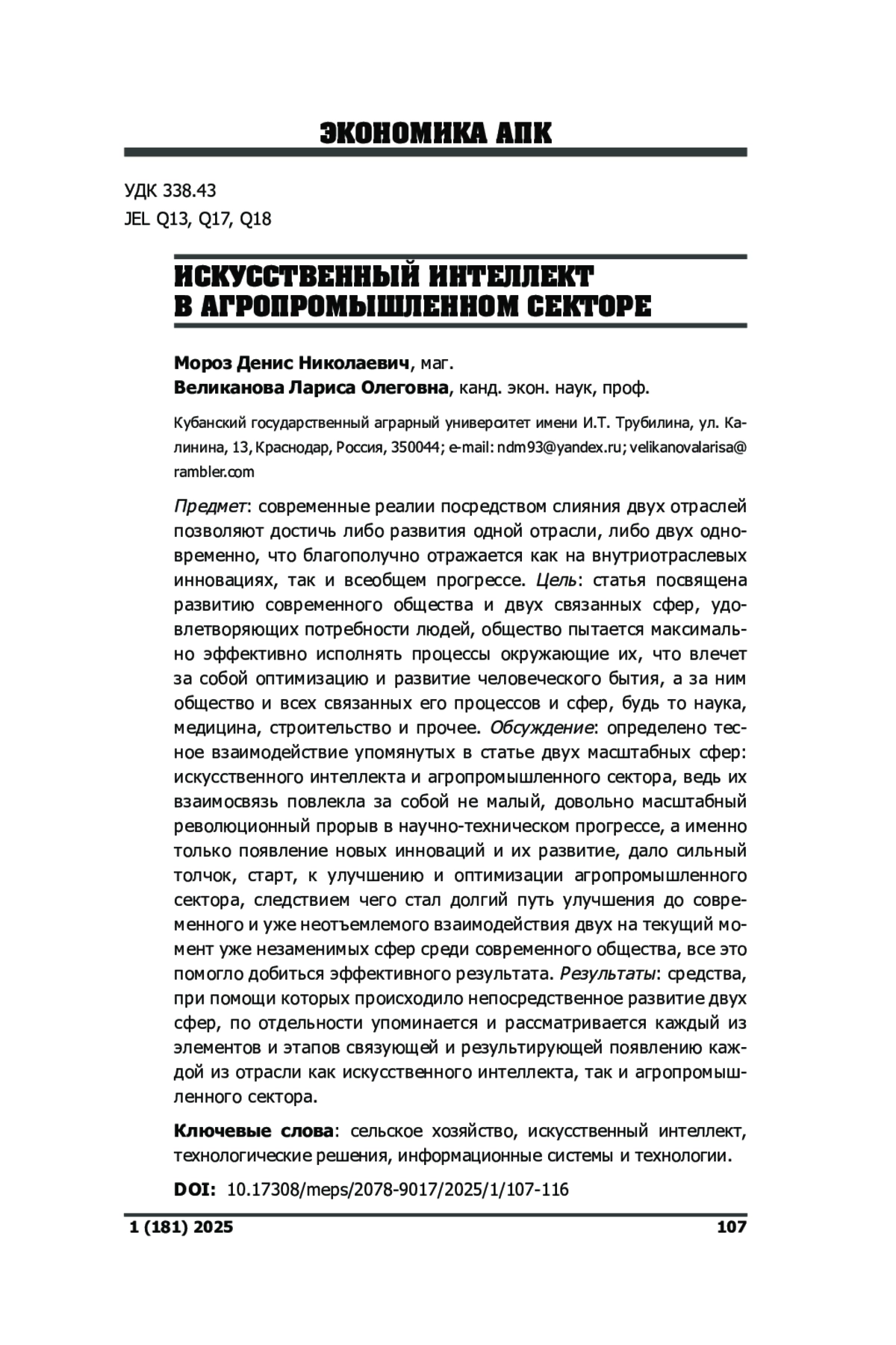 10. Осенний В.В., Ефимиади Л.К., Хроль Е.В. Перспективы внедрения искусственного интеллекта в АПК Краснодарского края // Труды Кубанского государственного аграрного университета, 2023, no. 106, с. 58-65. EDN: TZRAUR