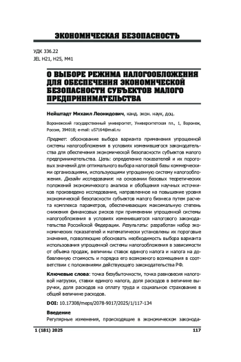 Предмет, обоснование выбора варианта применения упрощенной системы налогообложения в условиях изменившегося законодательства для обеспечения экономической безопасности субъектов малого предпринимательства. Цель: определение показателей и их пороговых значений для оптимального выбора налоговой базы коммерческими организациями, использующими упрощенную систему налогообложения. Дизайн исследования: на основании базовых теоретических положений экономического анализа и обобщения научных источников произведено исследование, направленное на повышение уровня экономической безопасности субъектов малого бизнеса путем расчета комплекса параметров, обеспечивающих максимальную степень снижения финансовых рисков при применении упрощенной системы налогообложения в условиях изменившегося налогового законодательства Российской Федерации. Результаты: разработан набор экономических показателей и математически установлены их пороговые значения, позволяющие обосновать необходимость выбора варианта использования упрощенной системы налогообложения в зависимости от объема продаж, величины ставок единого налога и налога на добавленную стоимость и порядка его возможного возмещения в соответствии с положениями действующего законодательства РФ.