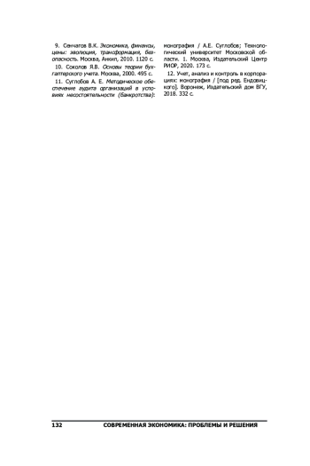 11. 	Суглобов А. Е. Методическое обеспечение аудита организаций в условиях несостоятельности (банкротства): монография / А.Е. Суглобов; Технологический университет Московской области. 1. Москва, Издательский Центр РИОР, 2020. 173 с. EDN: DCGMOY