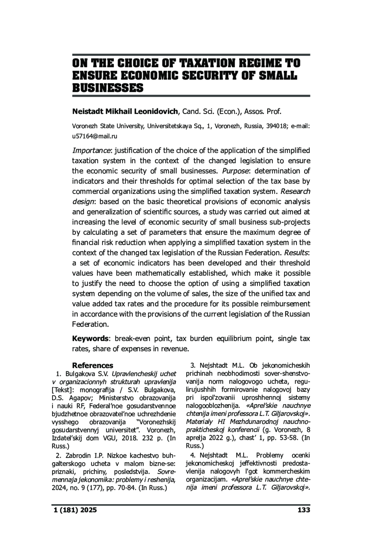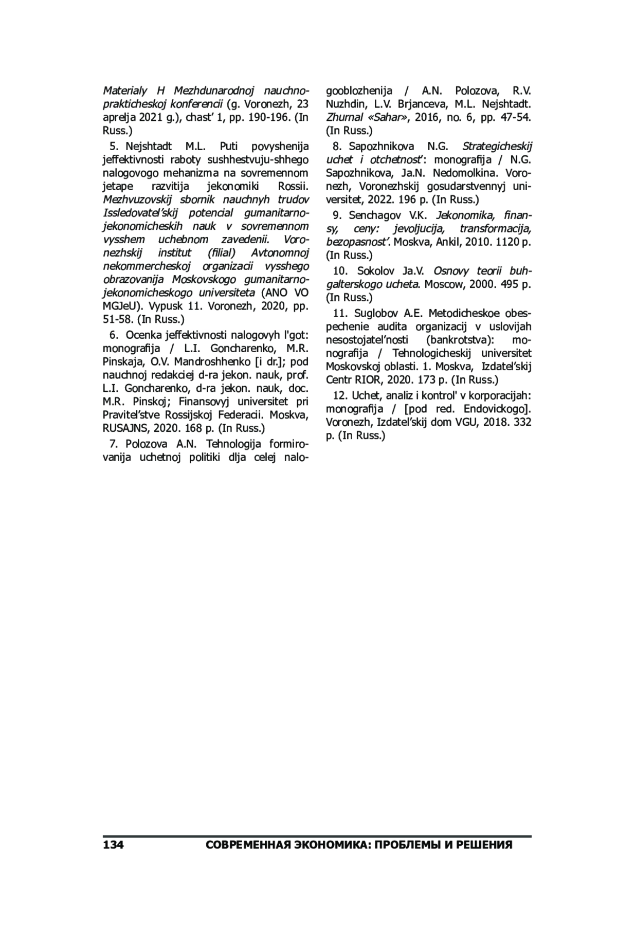 4. 	Нейштадт М.Л. Проблемы оценки экономической эффективности предоставления налоговых льгот коммерческим организациям // “Апрельские научные чтения имени профессора Л.Т. Гиляровской”. Материалы Х Международной научно-практической конференции (г. Воронеж, 23 апреля 2021 г.), ч. 1, с. 190-196. бизнеса до установленных законода-.