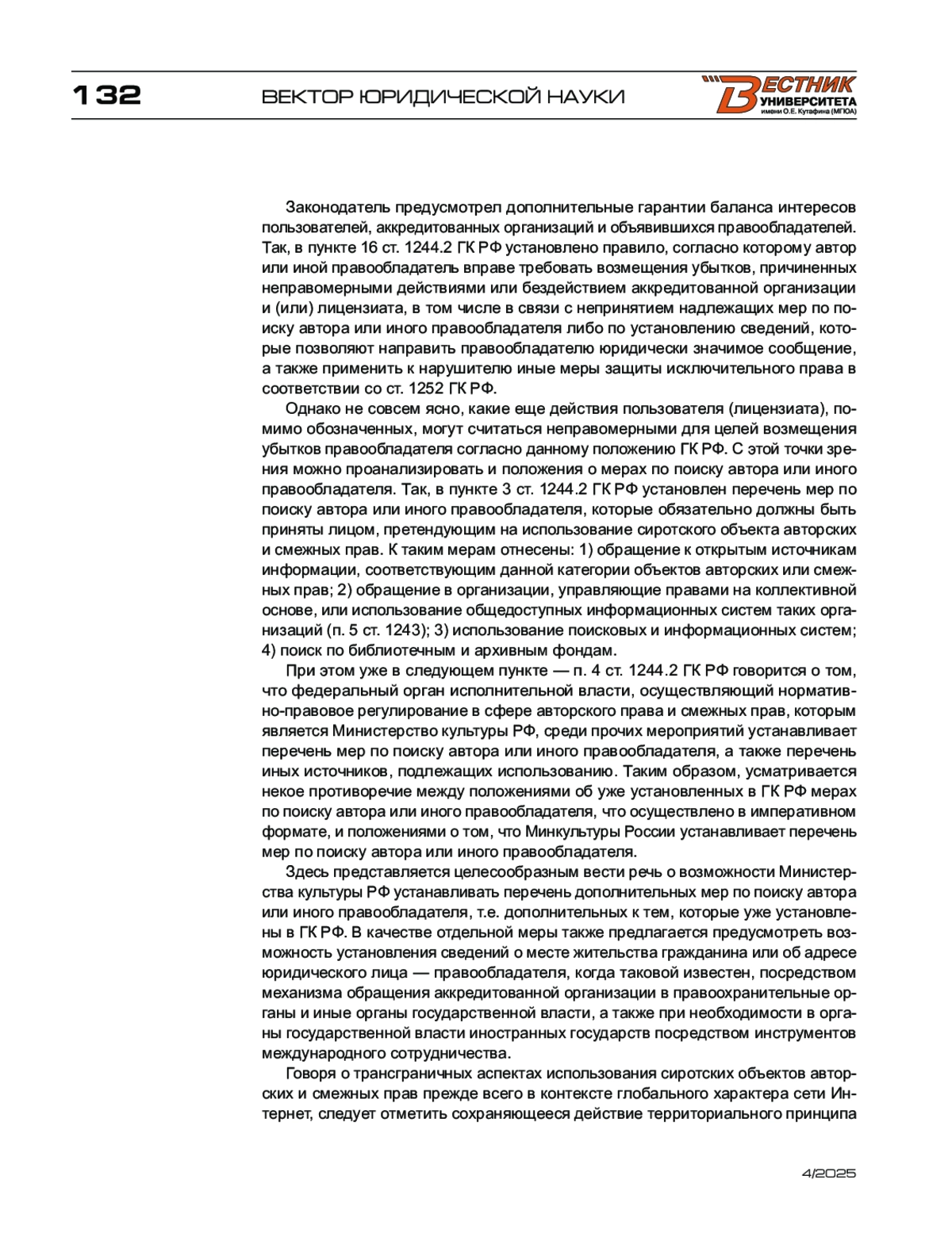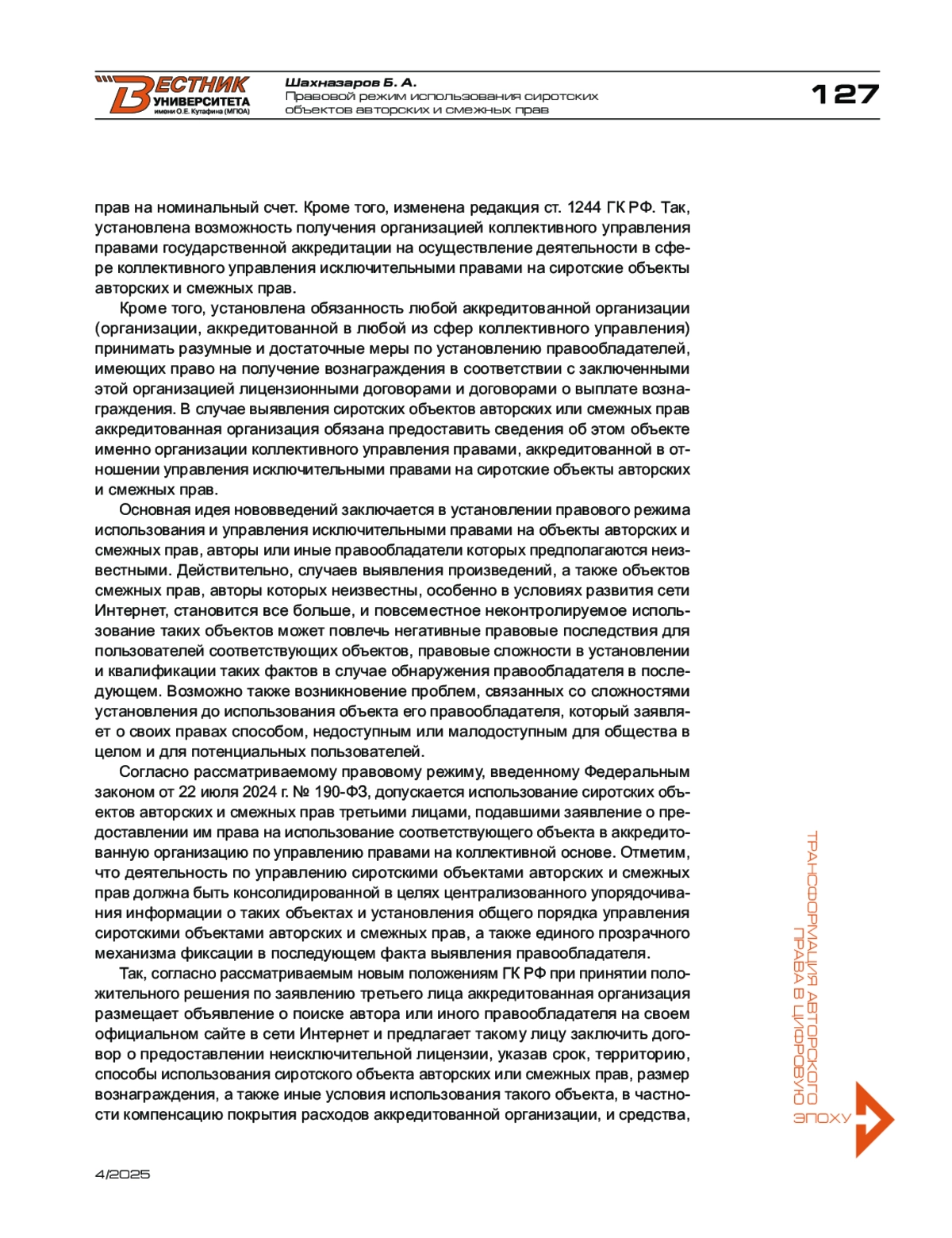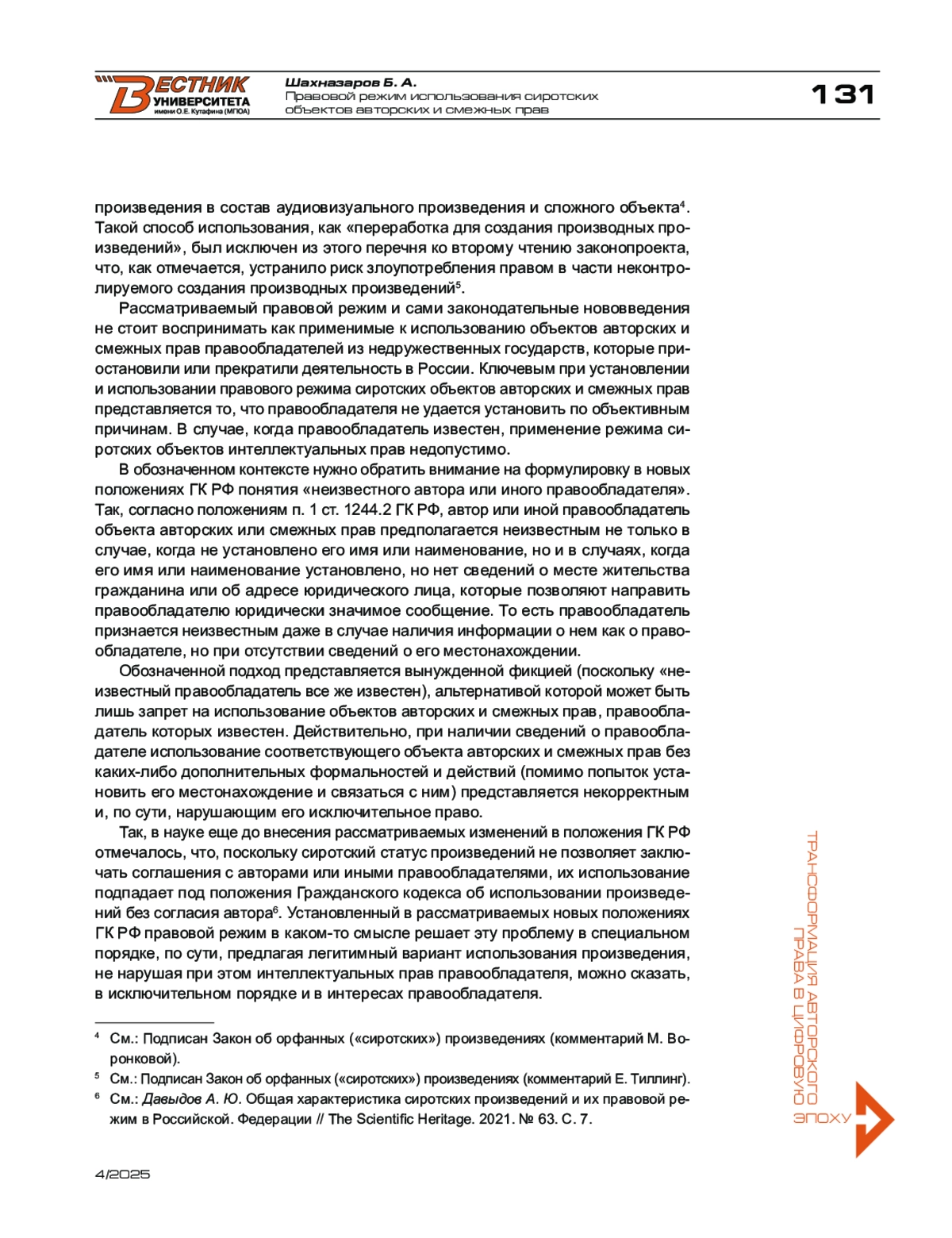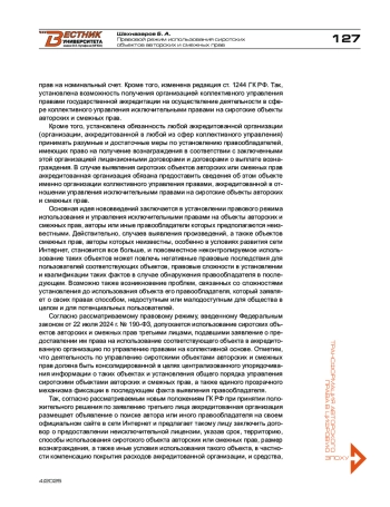 4. Рузакова О. А. Правовой режим произведений, правообладатель которых неизвестен («сиротские произведения»): перспективы российского законодательства // Имущественные отношения в Российской Федерации. - 2024. - № 7.