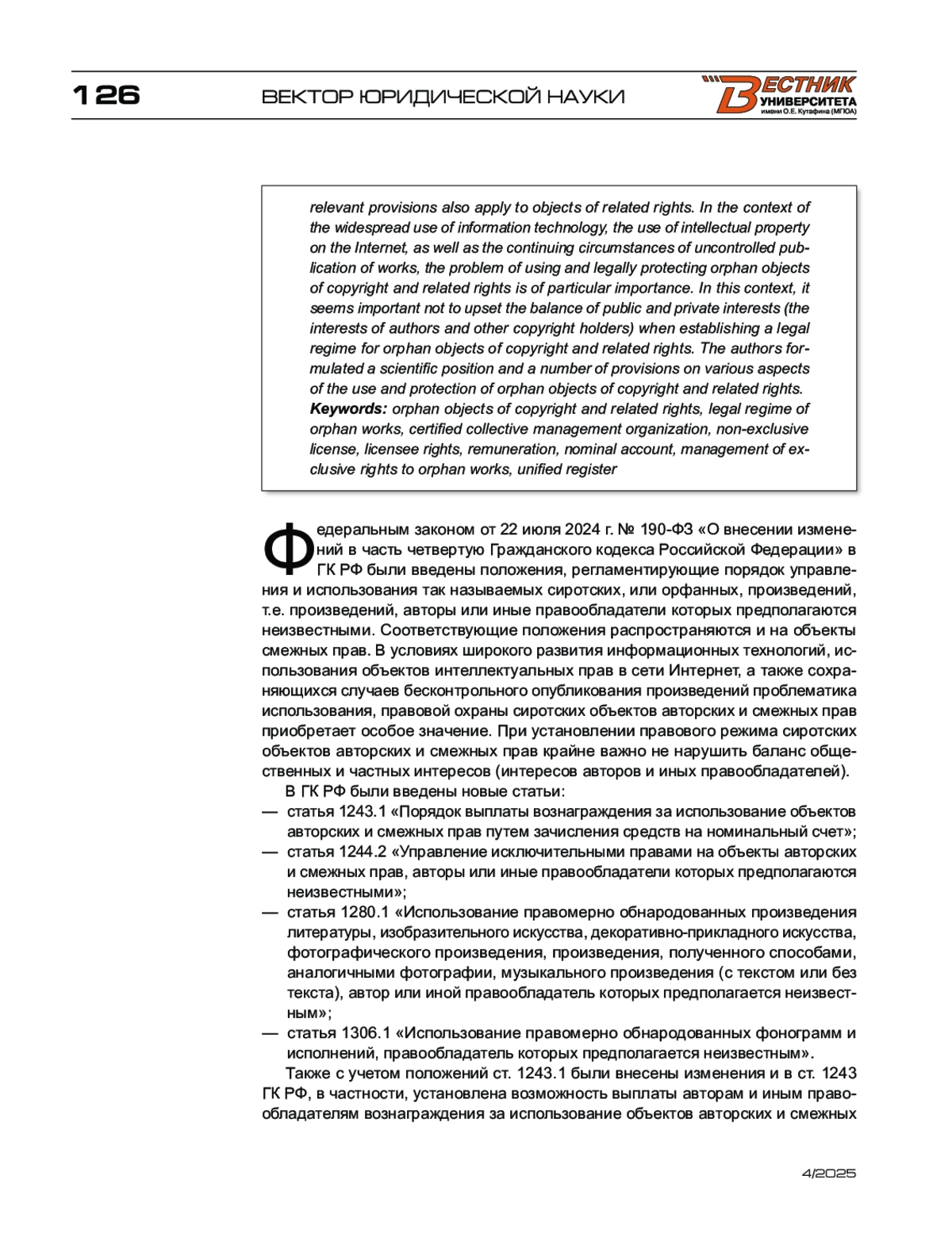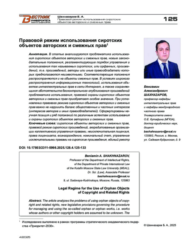 В статье анализируются проблематика использования сиротских объектов авторских и смежных прав, новые законодательные положения, регламентирующие порядок управления и использования так называемых сиротских, или орфанных, произведений, т. е. произведений, авторы или иные правообладатели, которых предполагаются неизвестными. Соответствующие положения распространяются и на объекты смежных прав. В условиях широкого распространения информационных технологий, использования объектов интеллектуальных прав в сети Интернет, а также сохраняющихся обстоятельств бесконтрольного опубликования произведений проблематика использования, правовой охраны сиротских объектов авторских и смежных прав приобретает особое значение. При установлении правового режима сиротских объектов авторских и смежных прав важно не нарушить баланс общественных и частных интересов (интересов авторов и иных правообладателей). Сформулированы научная позиция и ряд положений по различным аспектам использования и охраны сиротских объектов авторских и смежных прав.