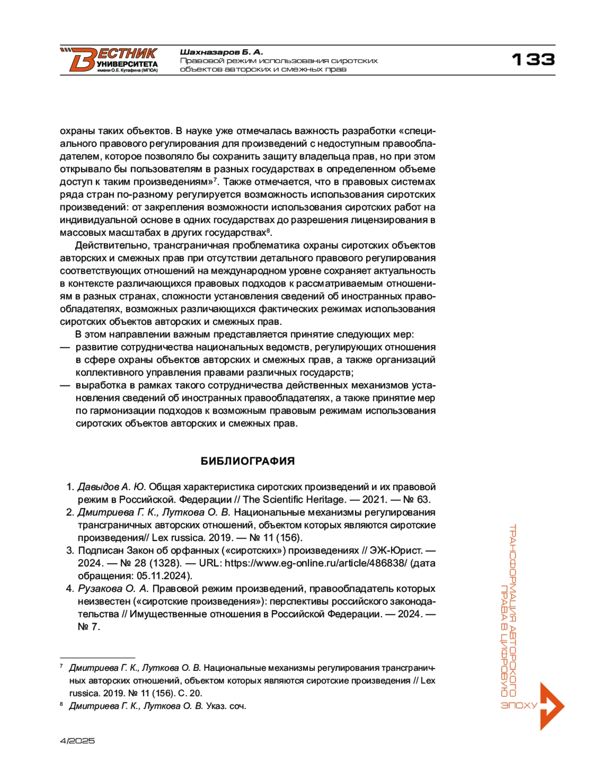 2. Дмитриева Г. К., Луткова О. В. Национальные механизмы регулирования трансграничных авторских отношений, объектом которых являются сиротские произведения// Lex russica. 2019. - № 11 (156).