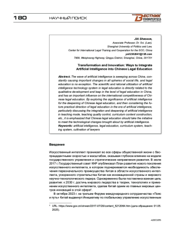 Искусственный интеллект, как волна, накрывает Китай, постоянно вызывая важные изменения во всех сферах общественной жизни, и юридическое образование не является исключением. Научное и рациональное использование системы технологий искусственного интеллекта в юридическом образовании напрямую связано с качественным развитием и скачком уровня юридического образования в Китае, оказывает важное влияние на международную конкурентоспособность китайского юридического образования. В статье исследуется значение искусственного интеллекта для углубления китайского юридического образования, рассматривается будущее практическое направление юридического образования в эпоху искусственного интеллекта, в частности, обсуждаются интеграция и углубленное использование искусственного интеллекта в режиме обучения, контроль качества преподавания, построение содержания учебных программ и т. д. При этом подчеркивается, что китайское юридическое образование должно взять на себя инициативу по воплощению технологических изменений, вызванных искусственным интеллектом, и построить комплексную систему обучения юристов, сочетающую юриспруденцию и техническое направление, чтобы адаптироваться к новым потребностям китайского юридического образования в эпоху искусственного интеллекта.