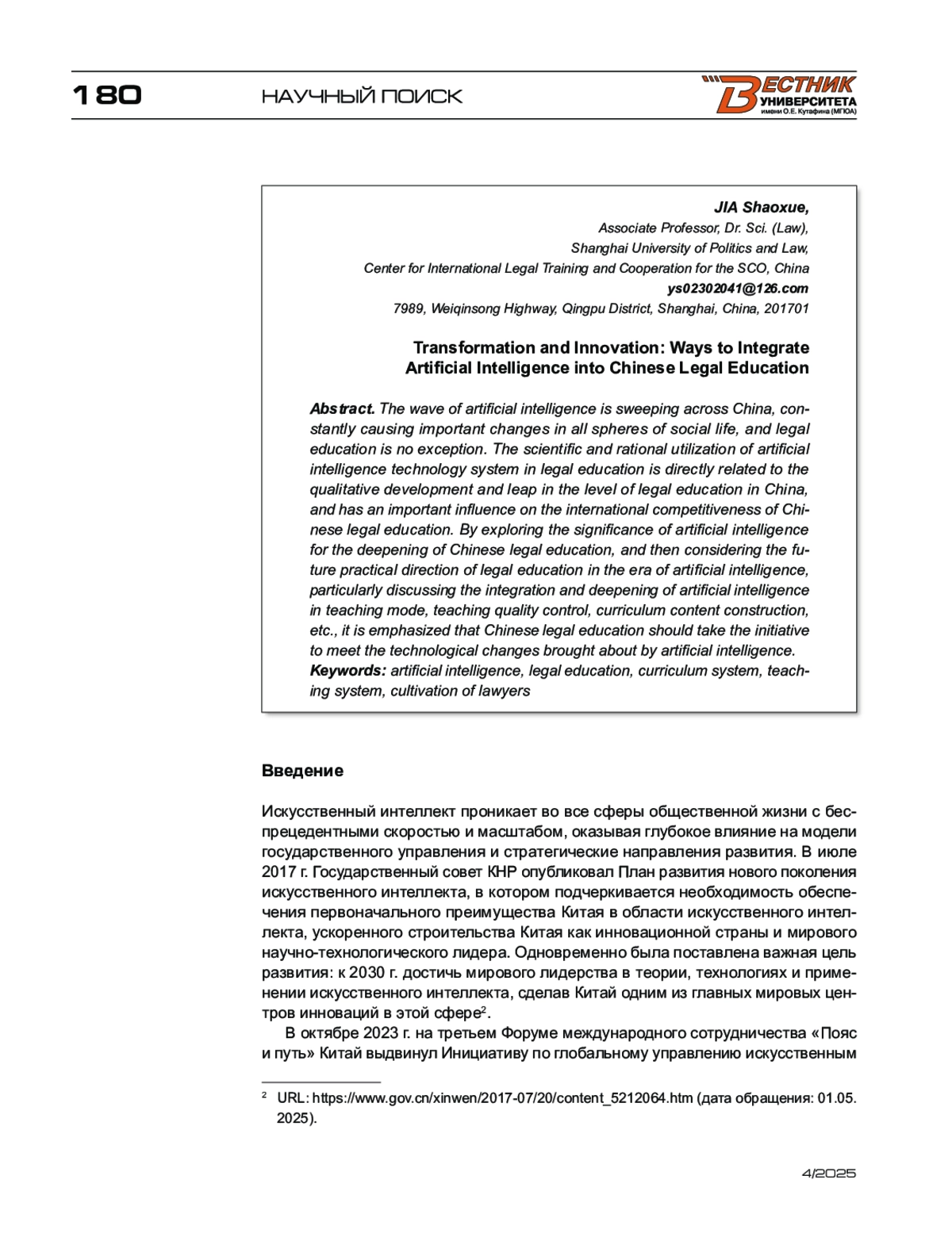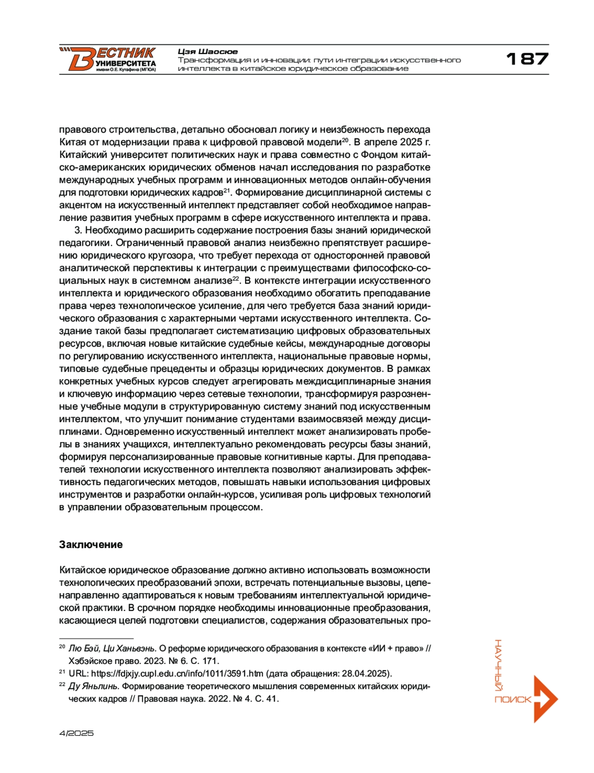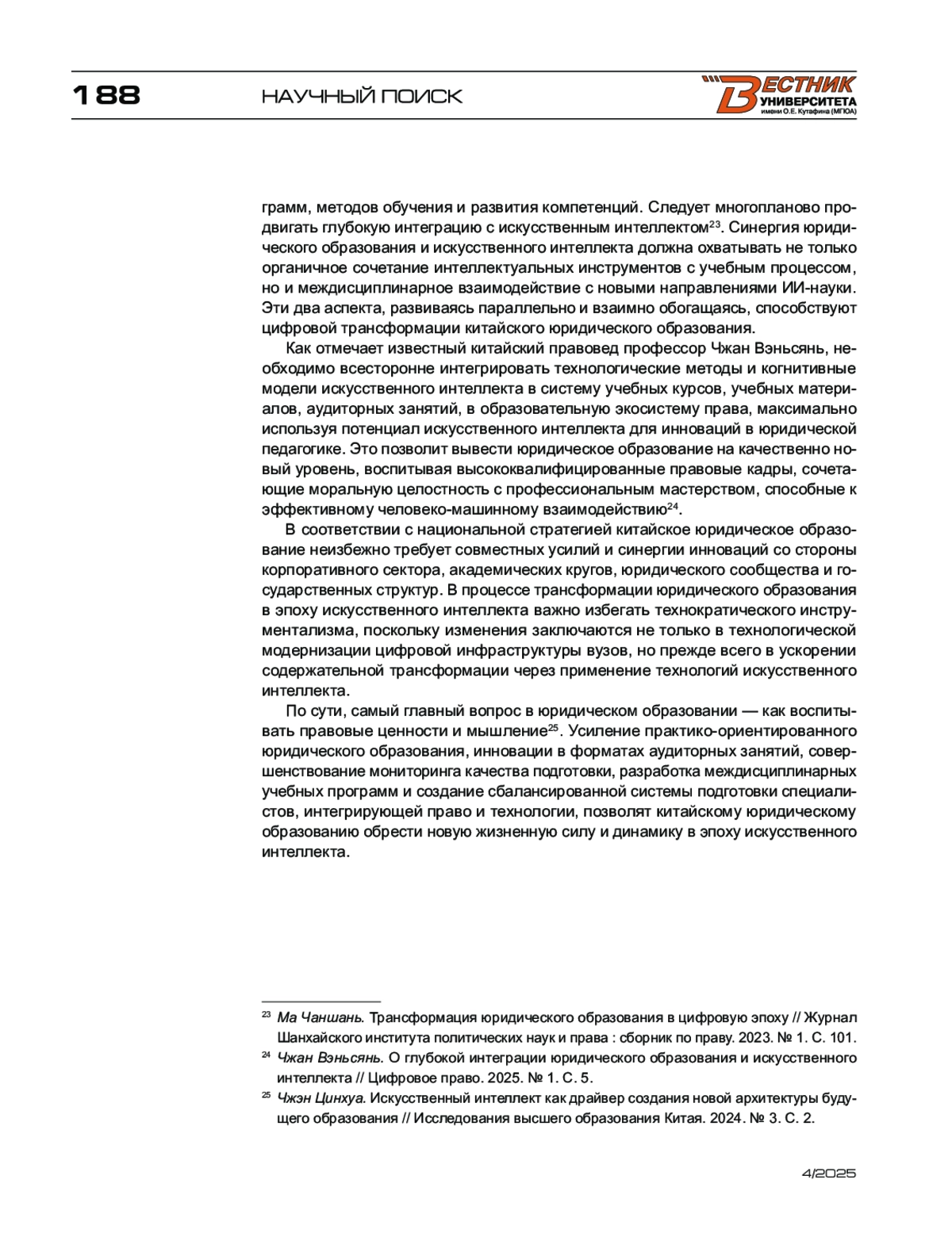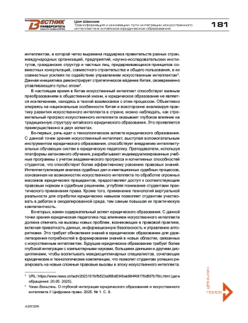 7. Чжан Вэньсянь. О глубокой интеграции юридического образования и искусственного интеллекта // Цифровое право. - 2025. - № 1.