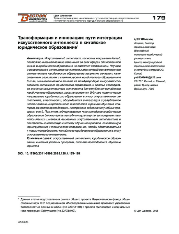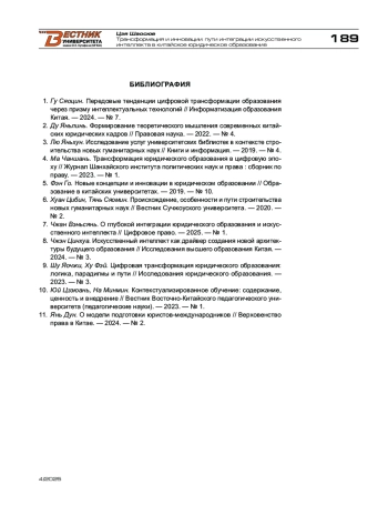 4. Ма Чаншань. Трансформация юридического образования в цифровую эпоху // Журнал Шанхайского института политических наук и права: сборник по праву. - 2023. - № 1.