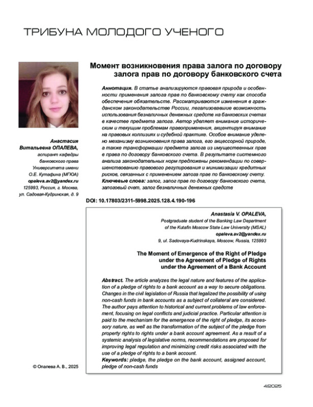 В статье анализируются правовая природа и особенности применения залога прав по банковскому счету как способа обеспечения обязательств. Рассматриваются изменения в гражданском законодательстве России, легализовавшие возможность использования безналичных денежных средств на банковских счетах в качестве предмета залога. Автор уделяет внимание историческим и текущим проблемам правоприменения, акцентируя внимание на правовых коллизиях и судебной практике. Особое внимание уделено механизму возникновения права залога, его акцессорной природе, а также трансформации предмета залога из имущественных прав в права по договору банковского счета. В результате системного анализа законодательных норм предложены рекомендации по совершенствованию правового регулирования и минимизации кредитных рисков, связанных с применением залога прав по банковскому счету.