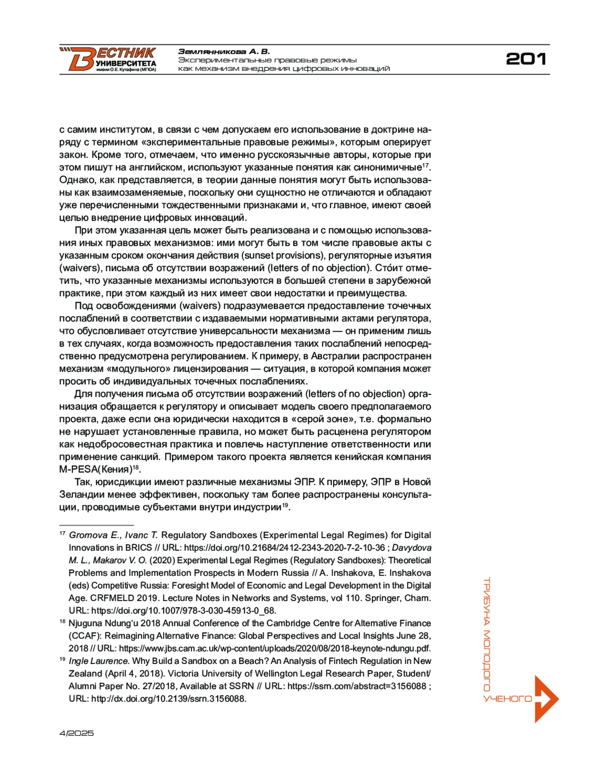 1. Громова Е. А. К вопросу об экспериментальных правовых режимах создания цифровых инноваций (регуляторных песочницах) // Вестник ЮУрГУ. - Серия: Право. - 2019. - № 3. - С. 36-40.