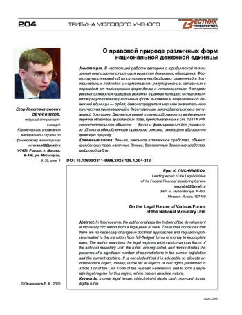 В настоящей работе автором с юридической точки зрения анализируется история развития денежного обращения. Формулируется вывод об отсутствии необходимых изменений в доктринальных подходах и нормативном регулировании, связанных с переходом от полноценных форм денег к неполноценным. Автором рассматриваются правовые режимы, в рамках которых осуществляется регулирование различных форм выражения национальной денежной единицы — рубля, демонстрируется наличие значительного количества противоречий в действующем законодательстве и актуальной доктрине. Делается вывод о целесообразности выделения в перечне объектов гражданских прав, представленном в ст. 128 ГК РФ, самостоятельного объекта — денег и формирования для указанного объекта обособленного правового режима, имеющего абсолютно правовую природу.
