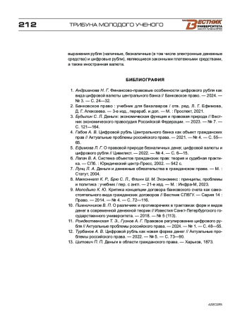 1. Андрианова Н. Г. Финансово-правовые особенности цифрового рубля как вида цифровой валюты центрального банка // Банковское право. - 2024. - № 3. - С. 24-32.