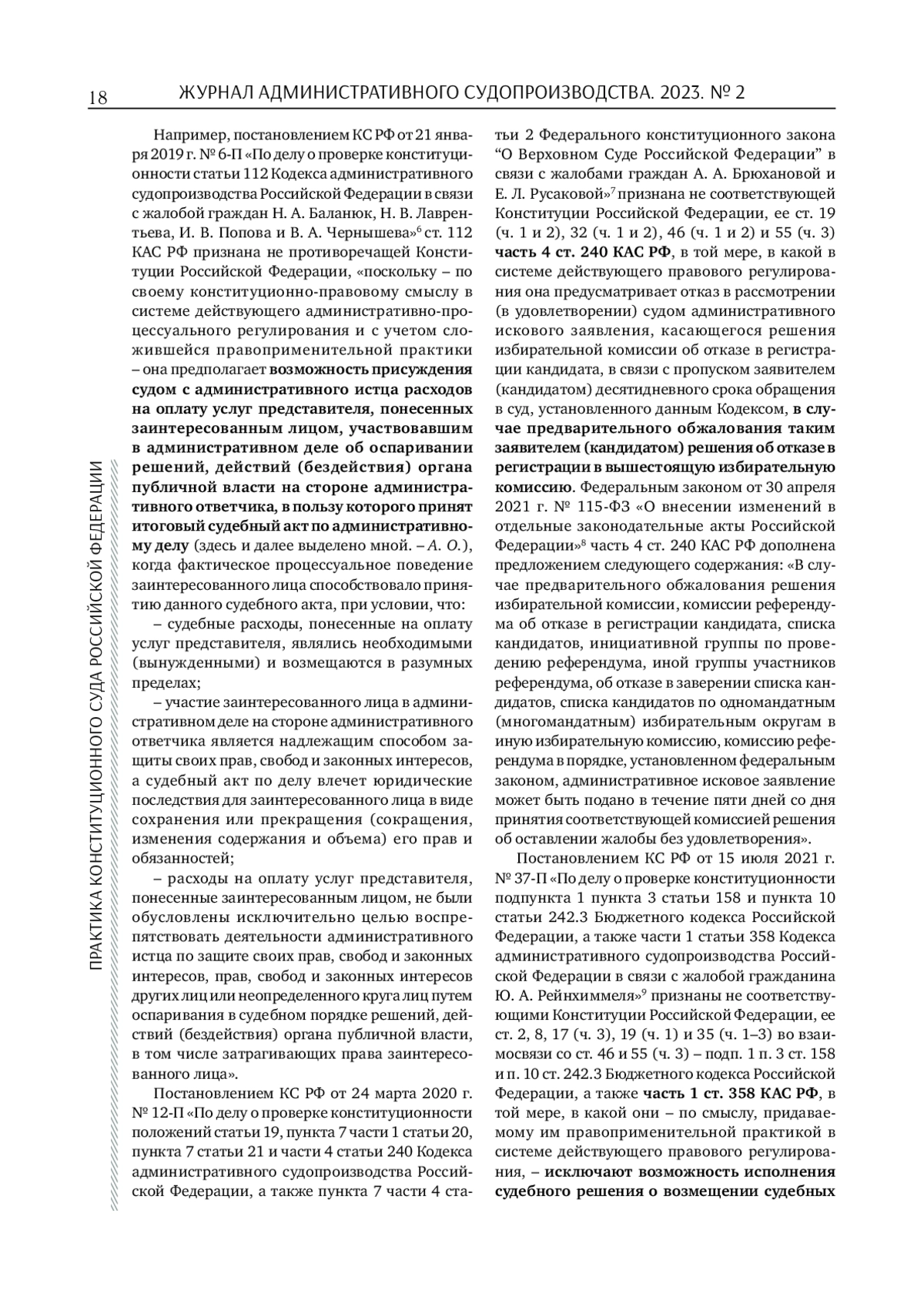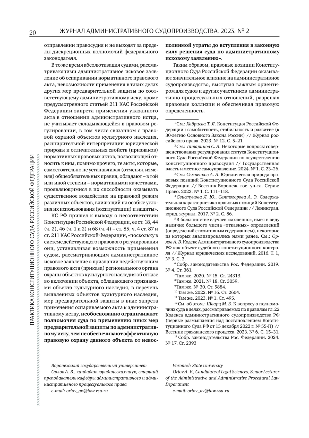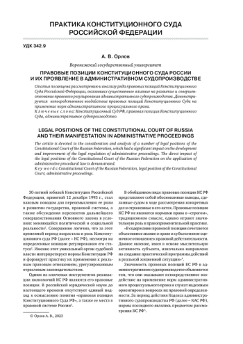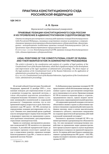 ОРЛОВ А. В. ПРАВОВЫЕ ПОЗИЦИИ КОНСТИТУЦИОННОГО СУДА РОССИИ И ИХ ПРОЯВЛЕНИЕ В АДМИНИСТРАТИВНОМ СУДОПРОИЗВОДСТВЕ // ЖУРНАЛ АДМИНИСТРАТИВНОГО СУДОПРОИЗВОДСТВА. 2023. № 2