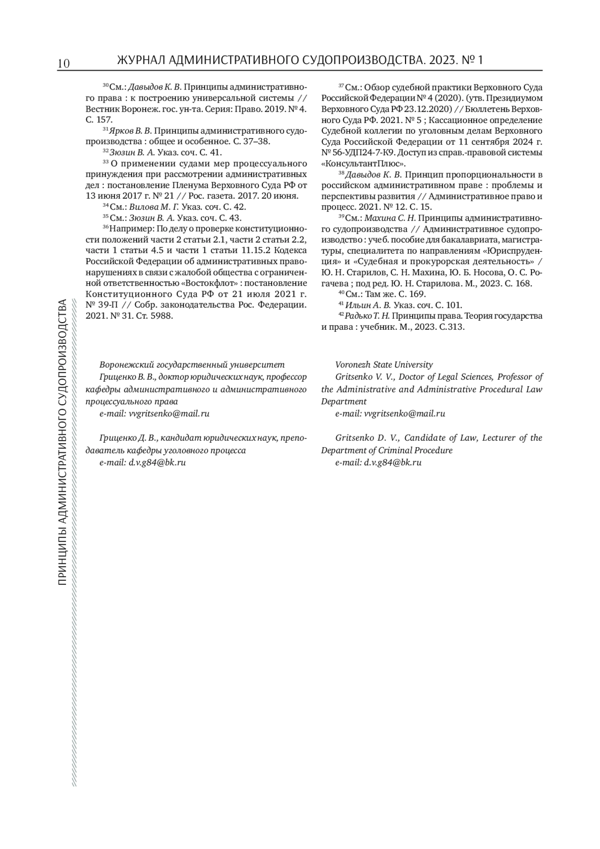 10. 	Ярков В. В. Принципы административного судопроизводства: общее и особенное // Вестник гражданского процесса. 2023. № 6. С. 36. EDN: DMPDEQ