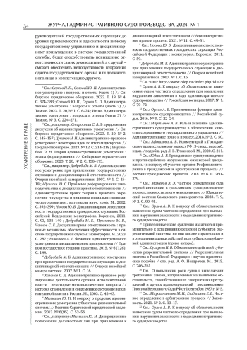 8. Добробаба М. Б. Административное усмотрение при привлечении государственных служащих к дисциплинарной ответственности // Очерки новейшей камералистики. 2007. № 1. С. 1518. EDN: INLGJP