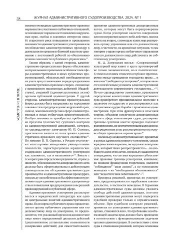 34. 	Соловей Ю. П. Дискреционный характер административного акта как обстоятельство, исключающее судебную проверку его законности // Право: журнал Высшей школы экономики. 2019. No 4. С. 74. EDN: ZVSKAI