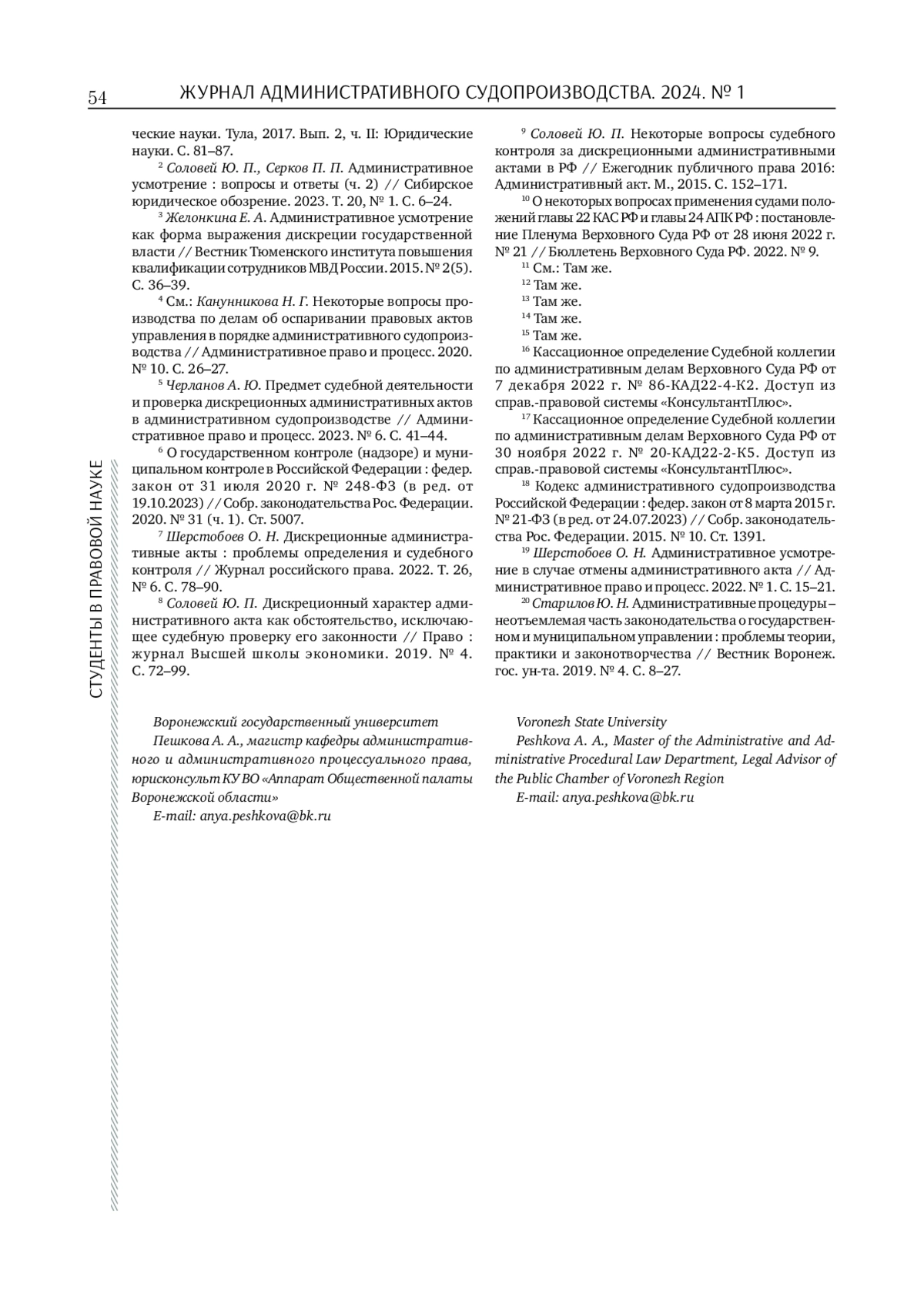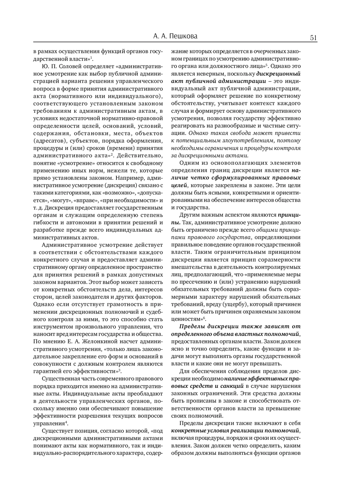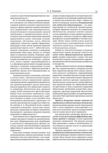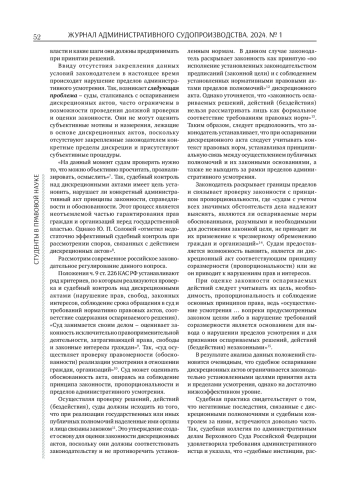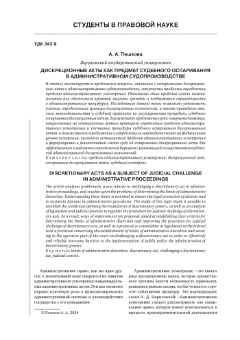 В статье анализируются проблемные вопросы, связанные с оспариванием дискреционного акта в административном судопроизводстве, затронуты проблемы определения пределов административного усмотрения. Понимание этих пределов имеет важное значение для обеспечения правовой защиты граждан и поддержания справедливости в административных процедурах. Исследование данной темы позволило установить условия, определяющие границы дискреционных полномочий, а также проведение анализа законодательства и судебной практики по регулированию процедуры судебного оспаривания дискреционных актов. В результате предложены пути совершенствования, направленные на установление четких критериев определения пределов административного усмотрения и улучшение процедуры судебного оспаривания дискреционных актов, а также внесено предложение о закреплении в законодательстве на федеральном уровне положения, касаемого установления пределов административного усмотрения и формулировки в резолютивной части суда об оспаривании дискреционного акта для эффективного и надежного преодоления барьеров с реализацией осуществления публичной администрацией дискреционных полномочий.
