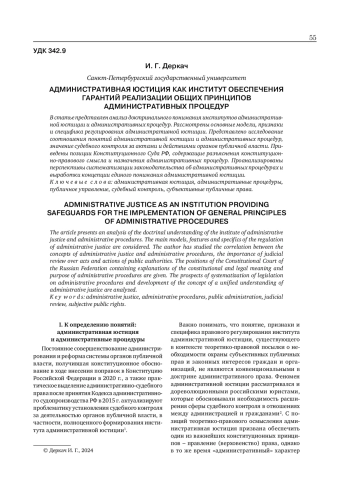 В статье представлен анализ доктринального понимания институтов административной юстиции и административных процедур. Рассмотрены основные модели, признаки и специфика регулирования административной юстиции. Представлено исследование соотношения понятий административной юстиции и административных процедур, значение судебного контроля за актами и действиями органов публичной власти. Приведены позиции Конституционного Суда РФ, содержащие разъяснения конституционно-правового смысла и назначения административных процедур. Проанализированы перспективы систематизации законодательства об административных процедурах и выработки концепции единого понимания административной юстиции.