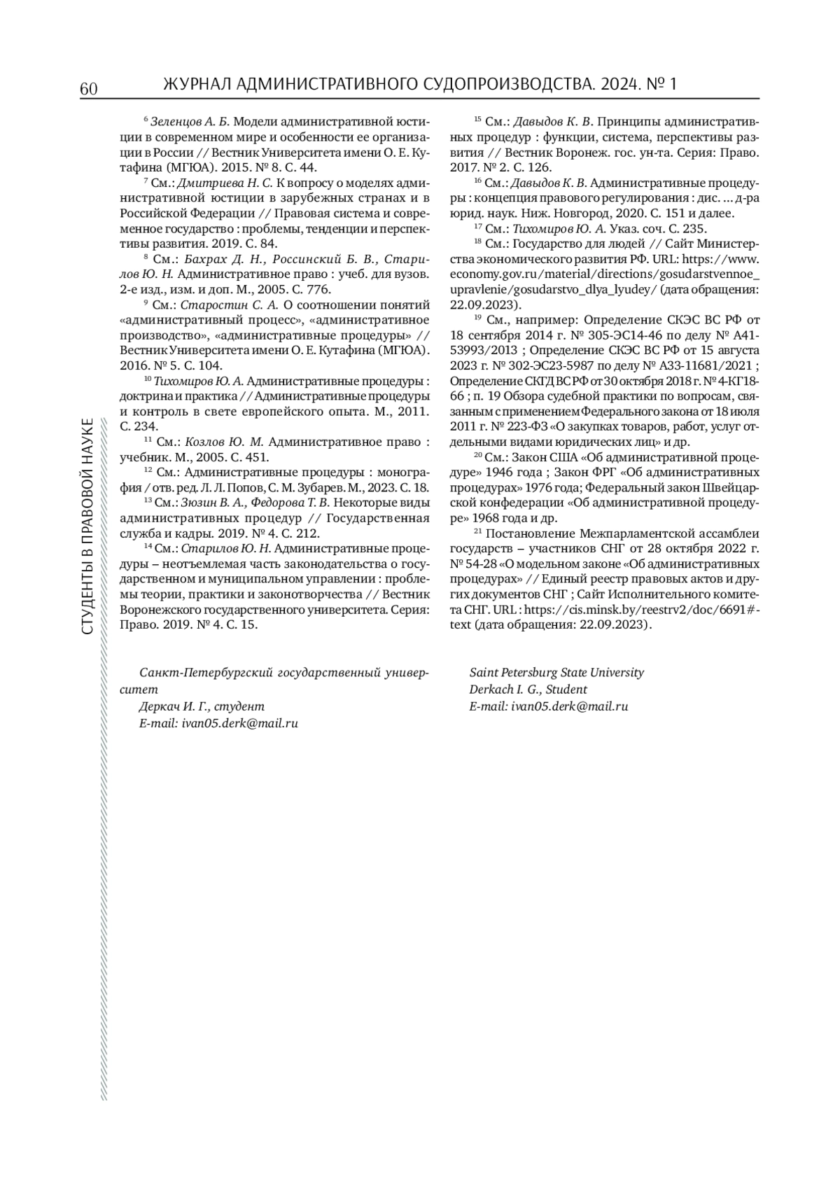 6. 	Зеленцов А. Б. Модели административной юстиции в современном мире и особенности ее организации в России // Вестник Университета имени О. Е. Кутафина (МГЮА). 2015. № 8. С. 44. EDN: UYHDVT