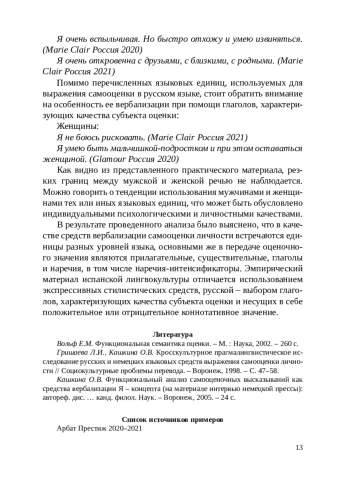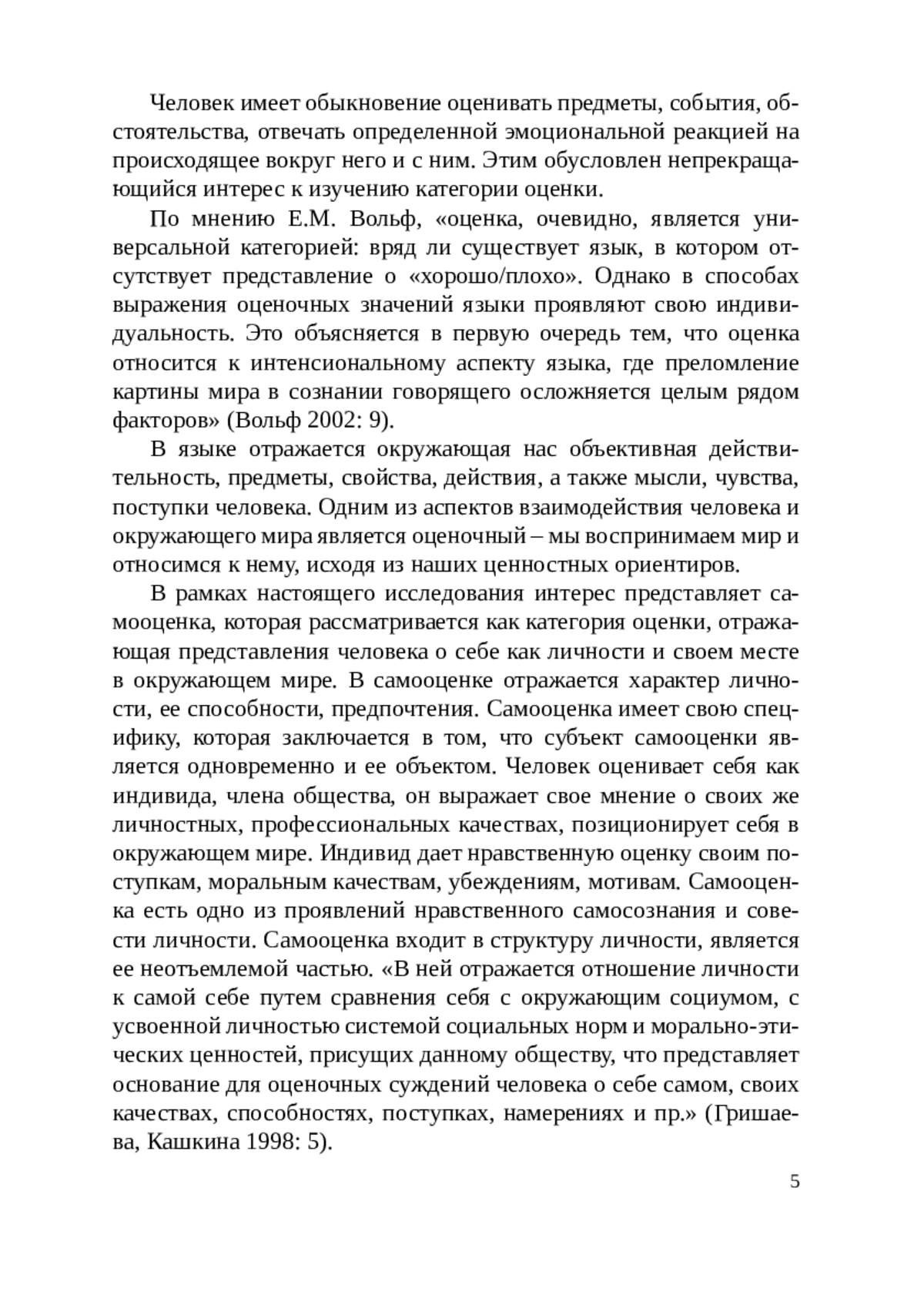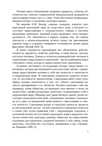 1. 	Вольф Е.М. Функциональная семантика оценки. - М.: Наука, 2002. - 260 с. Гришаева Л.И., Кашкина О.В. Кросскулътурное прагмалингвистическое исследование русских и немецких языковых средств выражения самооценки личности // Социокультурные проблемы перевода. - Воронеж, 1998. - С. 47-58.