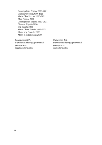 Данная статья посвящена анализу самооценочных высказываний с точки зрения языковых средств выражения самооценки в дискурсивных условиях интервью. Самооценка рассматривается в рамках категории оценки как ее частный случай, отличительной чертой которого является совпадение субъекта и объекта оценки. Исследование проводится в сопоставительном ключе на материале испанского и русского языков. Самооценочные высказывания анализируются с позиций гендерного подхода. Рассматриваются специфика выражения человеком оценки своей деятельности, личностных качеств, внешности, эмоционального состояния и темперамента. В процессе анализа практического материала выделяются наиболее характерные средства выражения самооценки личности. Подчеркивается специфика использования тех или иных единиц языка в зависимости от гендерной принадлежности личности. В конце статьи делаются выводы обобщающего характера по результатам проведенного анализа. This article is devoted to the linguistic means of expressing selfassessment when analyzing self-assessment statements in interviews. Selfassessment is studied as a particular category of assessment in which the subject and object of assessment are the same. Self-assessment statements in Spanish and Russian languages are analyzed to find out gender differences in expressing male and female assessment of their activities, personal qualities, appearance, emotional state and temperament. The most typical characteristic features of self-assessment are singled out and different language means of expressing self-assessment are identified. It is claimed that the language units used to characterize self-assessment by men and women depend on the gender of the individuals. At the end of the article, general conclusions are made to prove the results of the analysis.