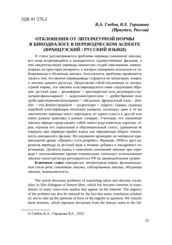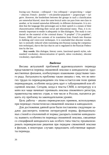 В статье рассматриваются проблемы перевода сниженной лексики, все чаще встречающейся в кинодиалогах художественных фильмов, о чем свидетельствуют переводы множества студий озвучивания, появляющиеся на просторах интернета, в которых намеренно используется табуированная и обсценная лексика. Актуальность проблемы проявляется также в том, что многие переводоведы стараются не затрагивать вопрос о лексике данного регистра. Представляя собой отклонения от литературной нормы, эти лексемы классифицируются нами следующим образом: русский язык - разговорное > просторечное (или разговорно-сниженное/фамильярное) > жаргонное/арго/сленг > грубое/бранное (или грубо-просторечное/вульгарное) > обсценное; французский язык - fam-ilier > tres familier/populaire > jargon/argot > vulgaire. Однако, границы подобной классификации несколько размыты, поскольку одни и те же лексические единицы могут переходить из одного класса в другой или иметь разную трактовку в разных словарях. Учитывая, что сниженная лексика нередко представляет собой своего рода визитную карточку героя, отражая его социальный и образовательный статус, адекватная ее передача при переводе крайне важна как передающая общую тональность кинодиалога фильма. Исследование проведено на материале криминальной драмы «Пророк» («Un prophete», Франция, 2009) и двух вариантов перевода на русский язык в технике дубляжа и закадрового озвучивания. Делается вывод о смягчении сниженной лексики при переводе с использованием приема компенсации, поскольку использование лексики такого регистра регулируется в РФ на законодательном уровне. The article discusses problems of translating taboo and obscene vocabulary in film dialogues of feature films, which has become common in translations of many voice-over studios that appear on the Internet. The urgency of the problem can also be stressed by the fact that many translation scholars try not to take up the question of lexis of the register in question. We classify these lexemes, which represent deviations from the literary norm in the fol lowing way: Russian - colloquial > low colloquial > jargon/slang > vulgar > obscene; French - familier > tres familier/populaire > jargon/argot > vulgaire. However, the borderlines between the groups in such a classification are somewhat blurred, since the same lexical units can pass from one class to another, or be treated somewhat differently in different dictionaries. It is evident that the language film personages use in their speech is a means of their characterization reflecting their social and educational status. Thus, it is extremely important to render it adequately in film dialogues. The study is conducted on the material of the criminal drama “A prophet” (“Un prophete”, France, 2009) and two variants of its translation from French into Russian in dubbing and voice-over techniques. It is concluded that obscene vocabulary is normally reduced when translating into Russian (using the compensation technique), due to the fact that its use is regulated in the Russian Federation by the law.
