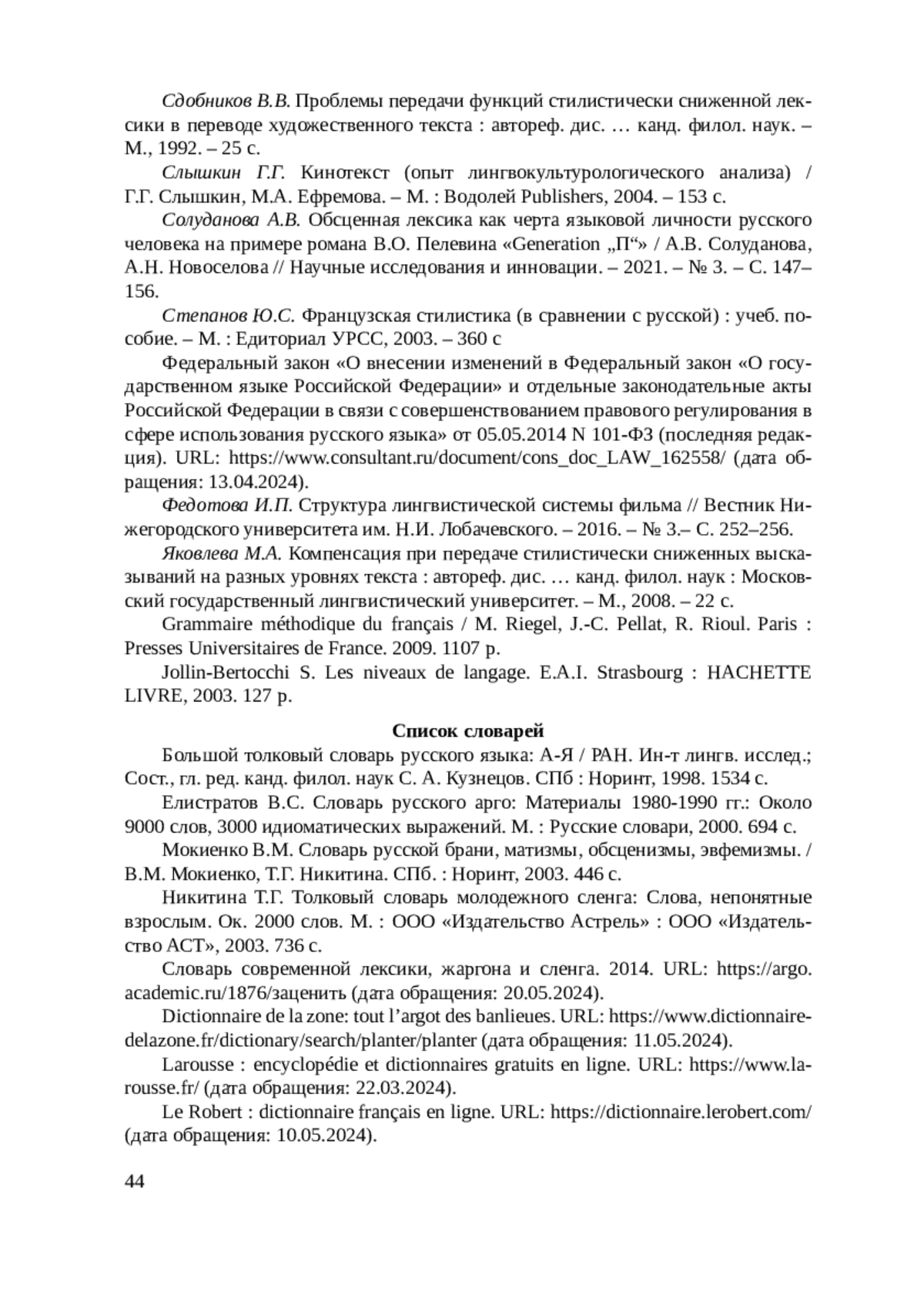 19. 	Федеральный закон “О внесении изменений в Федеральный закон “О государственном языке Российской Федерации” и отдельные законодательные акты Российской Федерации в связи с совершенствованием правового регулирования в сфере использования русского языка” от 05.05.2014 N 101-ФЗ (последняя редакция). URL: https://www.consultant.ru/document/cons_doc_LAW_162558/(дата обращения: 13.04.2024).